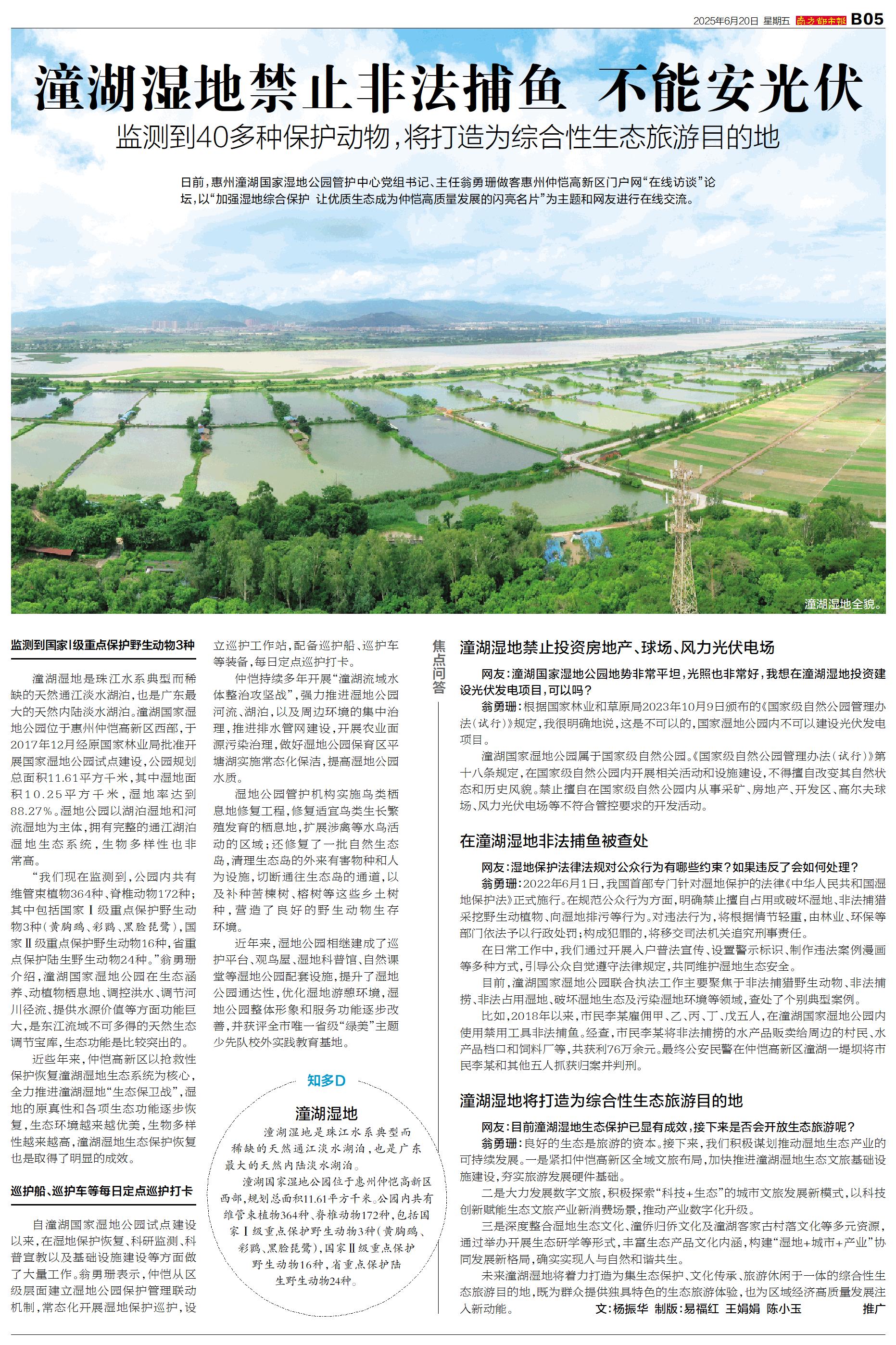 日前,惠州潼湖国家湿地公园管护中心党组书记、主任翁勇珊做客惠州仲恺高新区门户网“在线访谈”论坛,以“加强湿地综合保护 让优质生态成为仲恺高质量发展的闪亮名片”为主题和网友进行在线交流。 监测到国