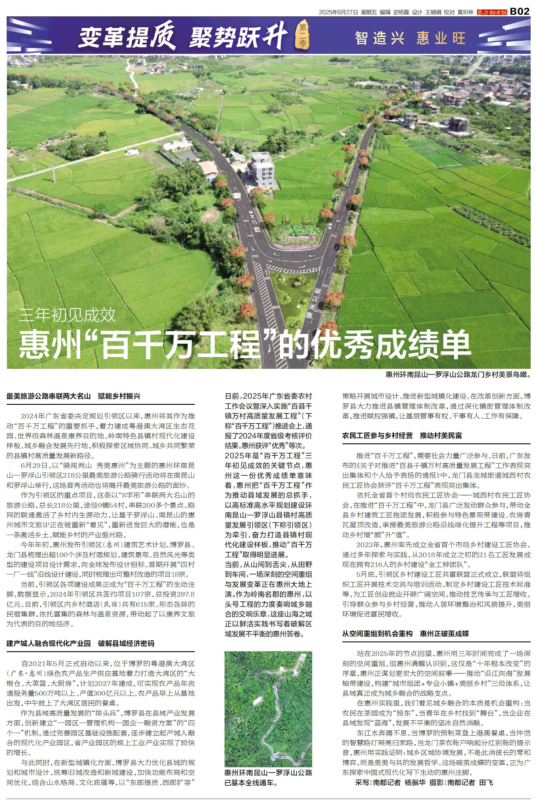 日前,2025年广东省委农村工作会议暨深入实施“百县千镇万村高质量发展工程”(下称“百千万工程”)推进会上,通报了2024年度省级考核评价结果,惠州获评“优秀”等次。 2025年是“百千万工程”