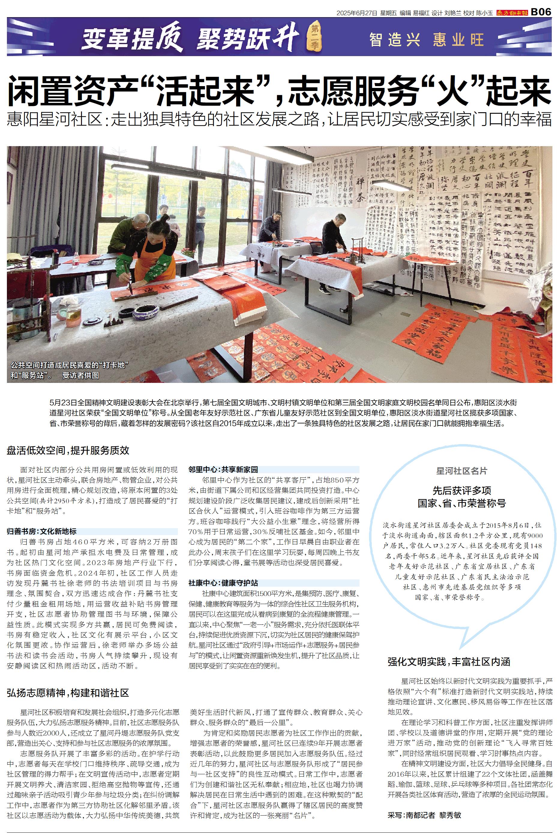 5月23日全国精神文明建设表彰大会在北京举行,第七届全国文明城市、文明村镇文明单位和第三届全国文明家庭文明校园名单同日公布,惠阳区淡水街道星河社区荣获“全国文明单位”称号。从全国老年友好示范社区、