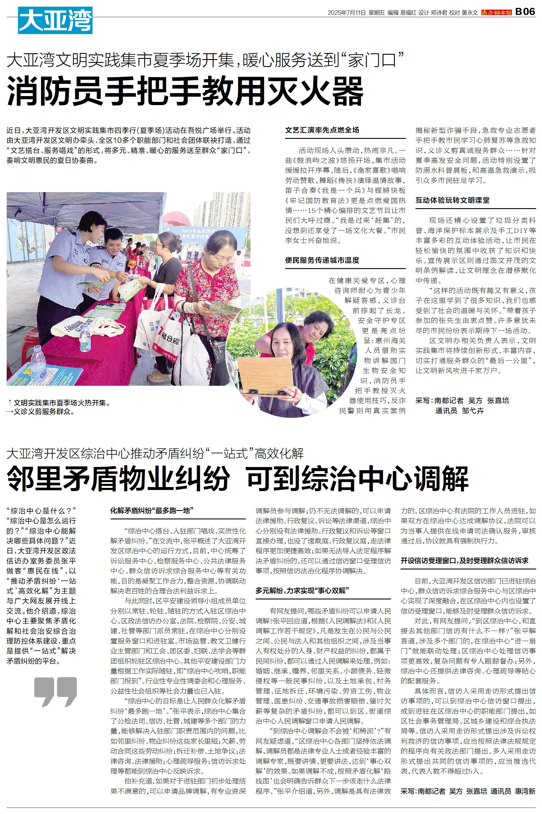 在健康关爱专区,心理咨询师耐心为青少年解疑答惑,义诊台前排起了长龙。安全守护专区更是亮点纷呈:惠州海关人员借助实物讲解国门生物安全知识,消防员手把手教授灭火器使用技巧,反诈民警则用真实案例揭秘新型诈骗手段,急救专业志愿者手把手教市民学习心肺复苏等急救知识,义诊义剪真诚服务群众……针对夏季高发安全问题,活动特别设置了防溺水科普展板,和高温急救演示,吸引众多市民驻足学习。