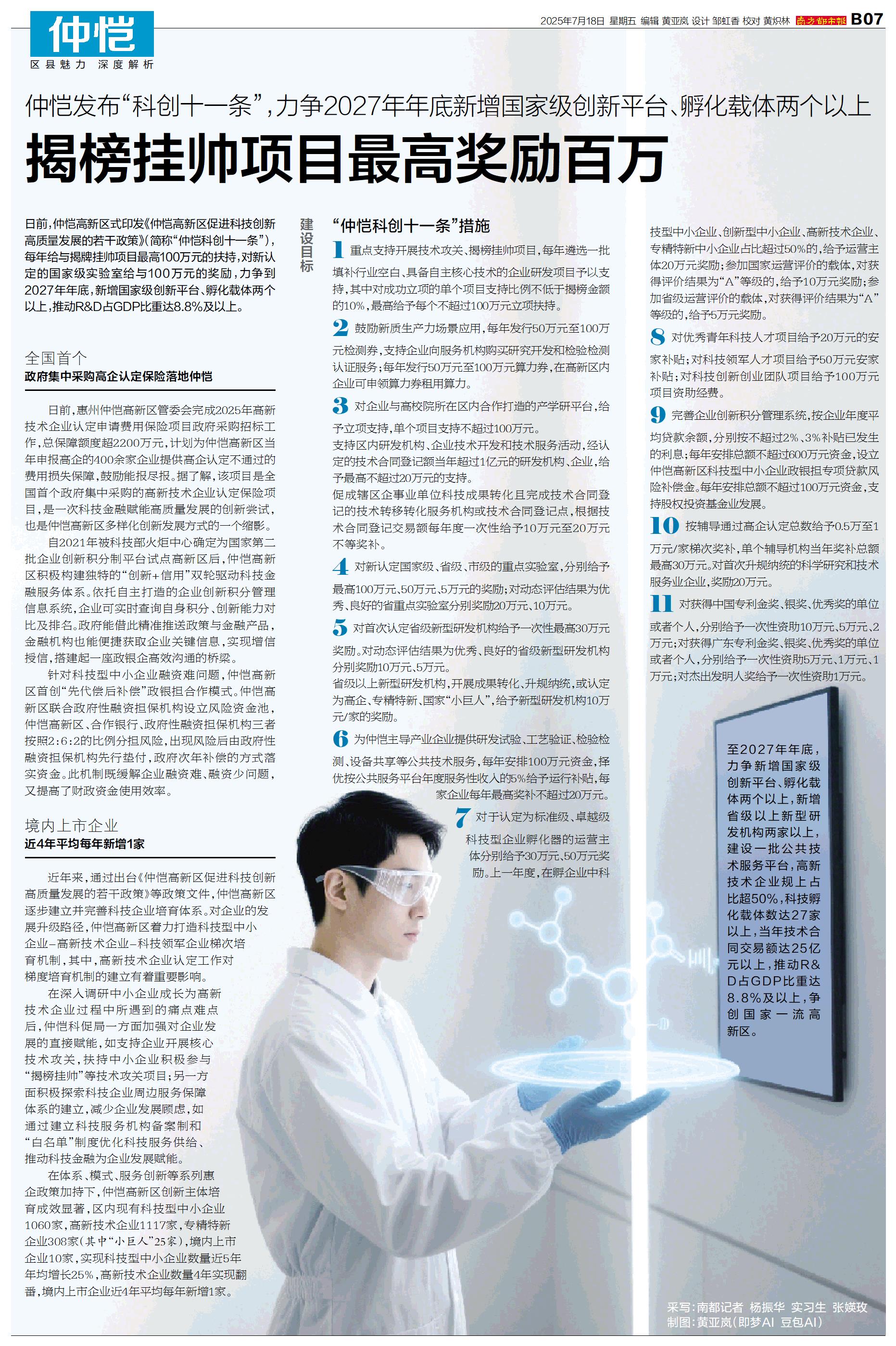 日前,仲恺高新区式印发《仲恺高新区促进科技创新高质量发展的若干政策》(简称“仲恺科创十一条”),每年给与揭牌挂帅项目最高100万元的扶持,对新认定的国家级实验室给与100万元的奖励,力争到2027年年底,新增国家级创新平台、孵化载体两个以上,推动R&D占GDP比重达8.8%及以上。