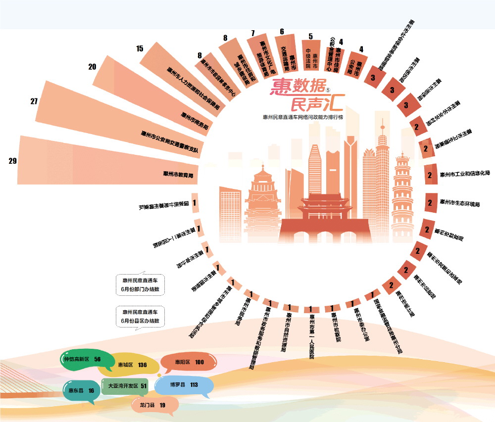 7月25日,惠州民意直通车网络问政能力6月排行榜出炉。部门方面,惠州市教育局以29件办结数位列榜首,惠州市公安局交通警察支队以27件办结数排行第二。县区方面,惠城区以136件办结数领跑。
