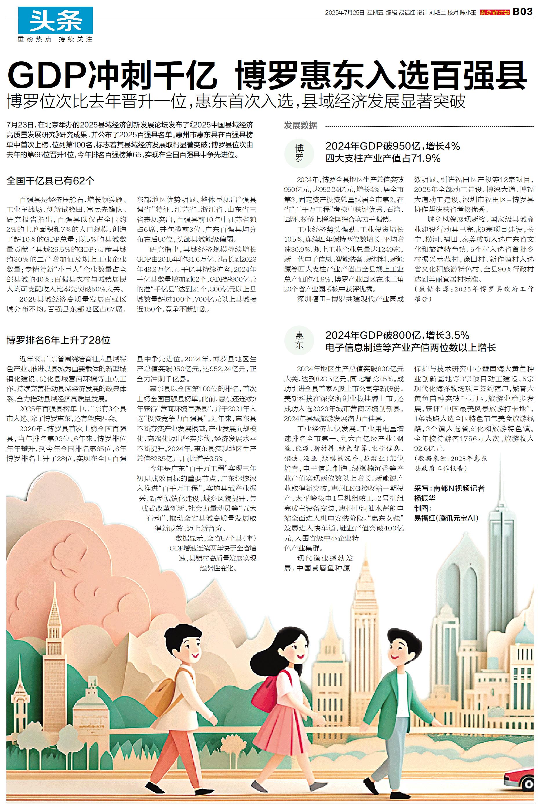 7月23日,在北京举办的2025县域经济创新发展论坛发布了《2025中国县域经济高质量发展研究》研究成果,并公布了2025百强县名单。惠州市惠东县在百强县榜单中首次上榜,位列第100名,标志着其县