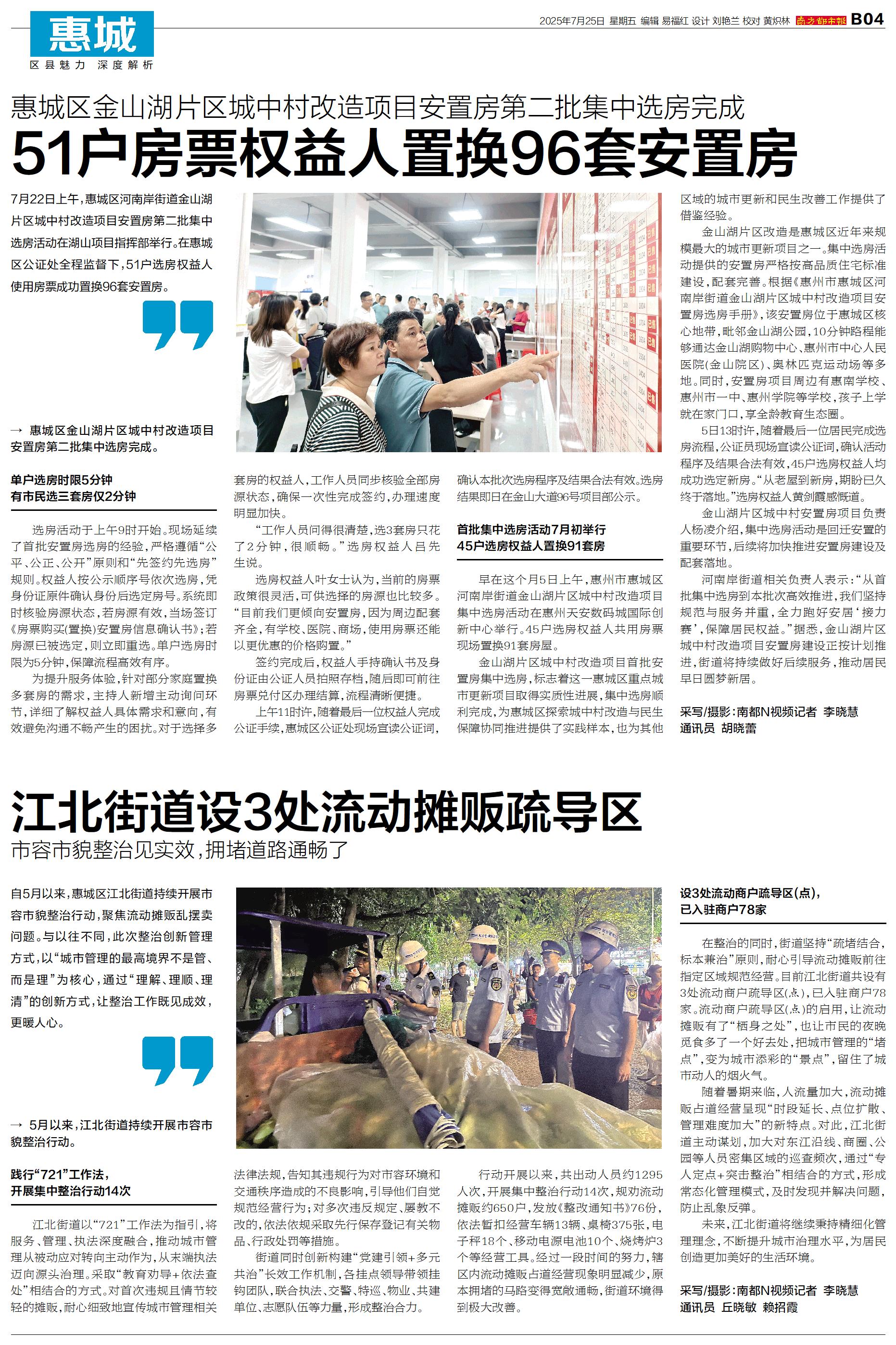 7月22日上午,惠城区河南岸街道金山湖片区城中村改造项目安置房第二批集中选房活动在湖山项目指挥部举行。在惠城区公证处全程监督下,51户选房权益人使用房票成功置换96套安置房。 单户选房时限5分钟
