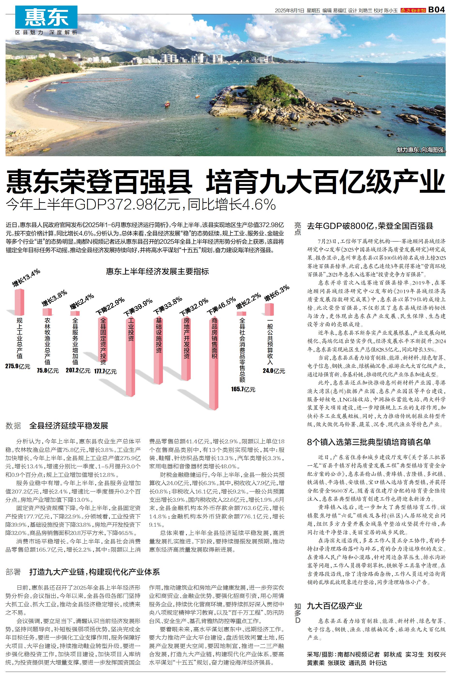 近日,惠东县人民政府官网发布《2025年1-6月惠东经济运行简析》,今年上半年,该县实现地区生产总值372.98亿元,按不变价格计算,同比增长4.6%。分析认为,总体来看,全县经济发展“稳”的态势延续,规上工业、服务业、金融业等多个行业“进”的态势明显。南都N视频记者还从惠东县召开的2025年全县上半年经济形势分析会上获悉,该县将锚定全年目标任务不动摇,推动全县经济发展持续向好,并将高水平谋划“十五五”规划,奋力建设海洋经济强县。