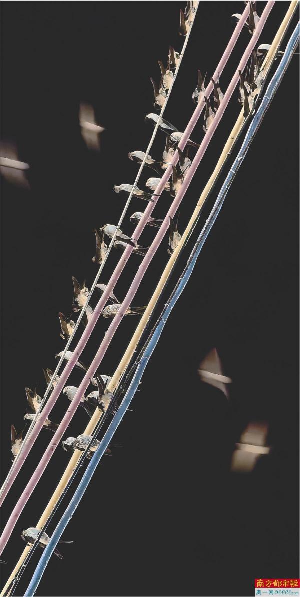 夜幕降临,惠东宝口镇佐坑村街道电线上歇息着上百只燕子。 南都记者 田飞 摄
