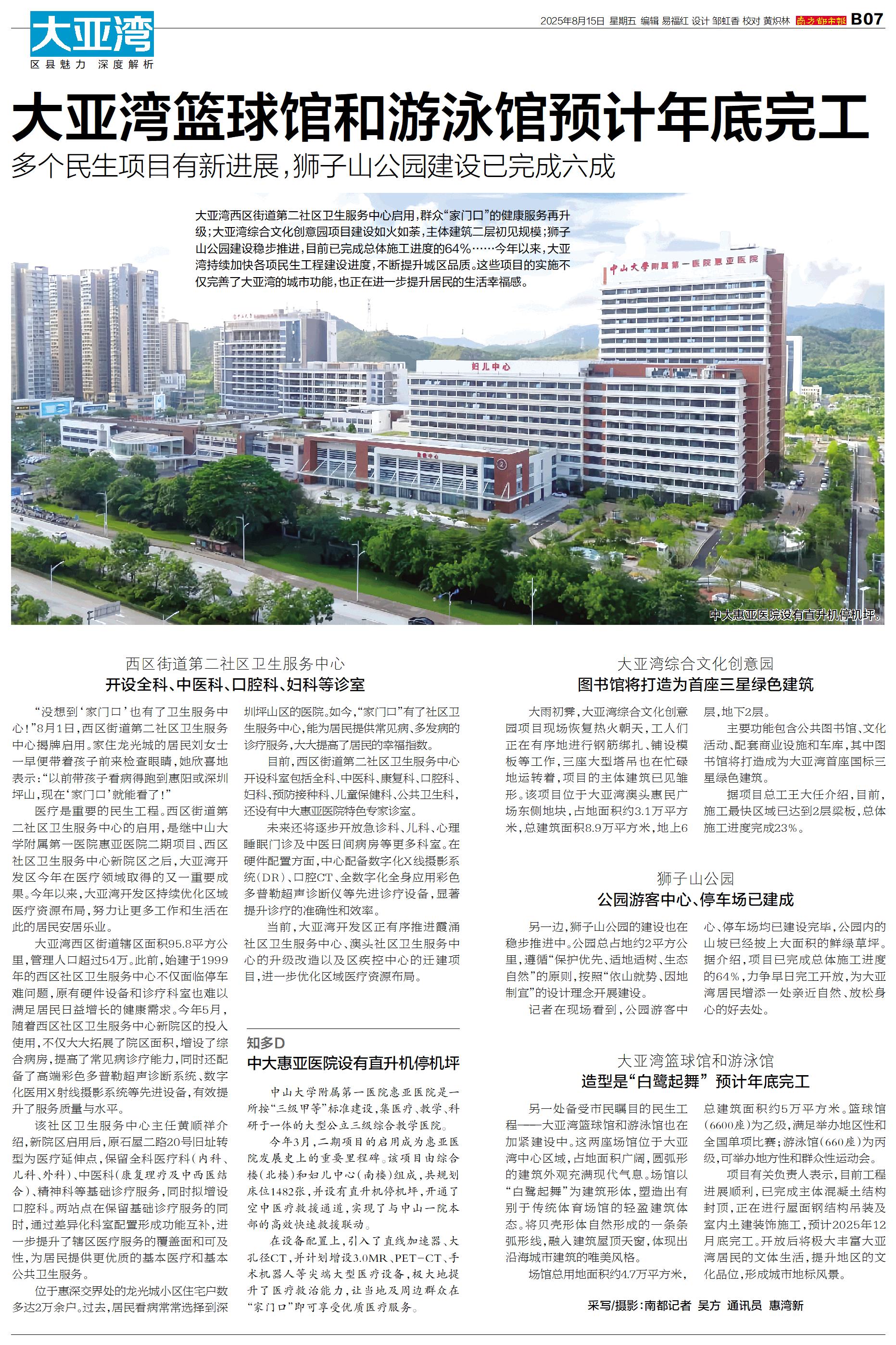 大亚湾西区街道第二社区卫生服务中心启用,群众“家门口”的健康服务再升级;大亚湾综合文化创意园项目建设如火如荼,主体建筑二层初见规模;狮子山公园建设稳步推进,目前已完成总体施工进度的64%……今年以