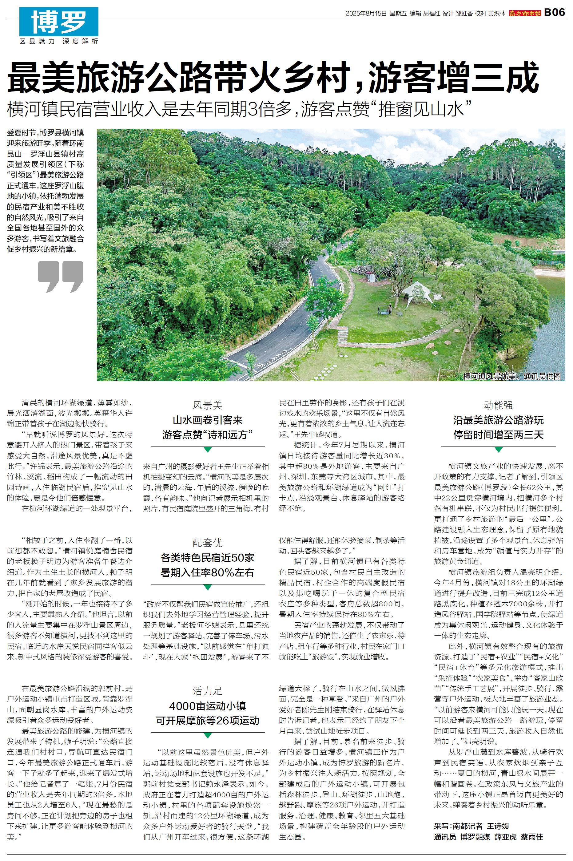 盛夏时节,博罗县横河镇迎来旅游旺季。随着环南昆山—罗浮山县镇村高质量发展引领区(下称“引领区”)最美旅游公路正式通车,这座罗浮山腹地的小镇,依托蓬勃发展的民宿产业和美不胜收的自然风光,吸引了来自全