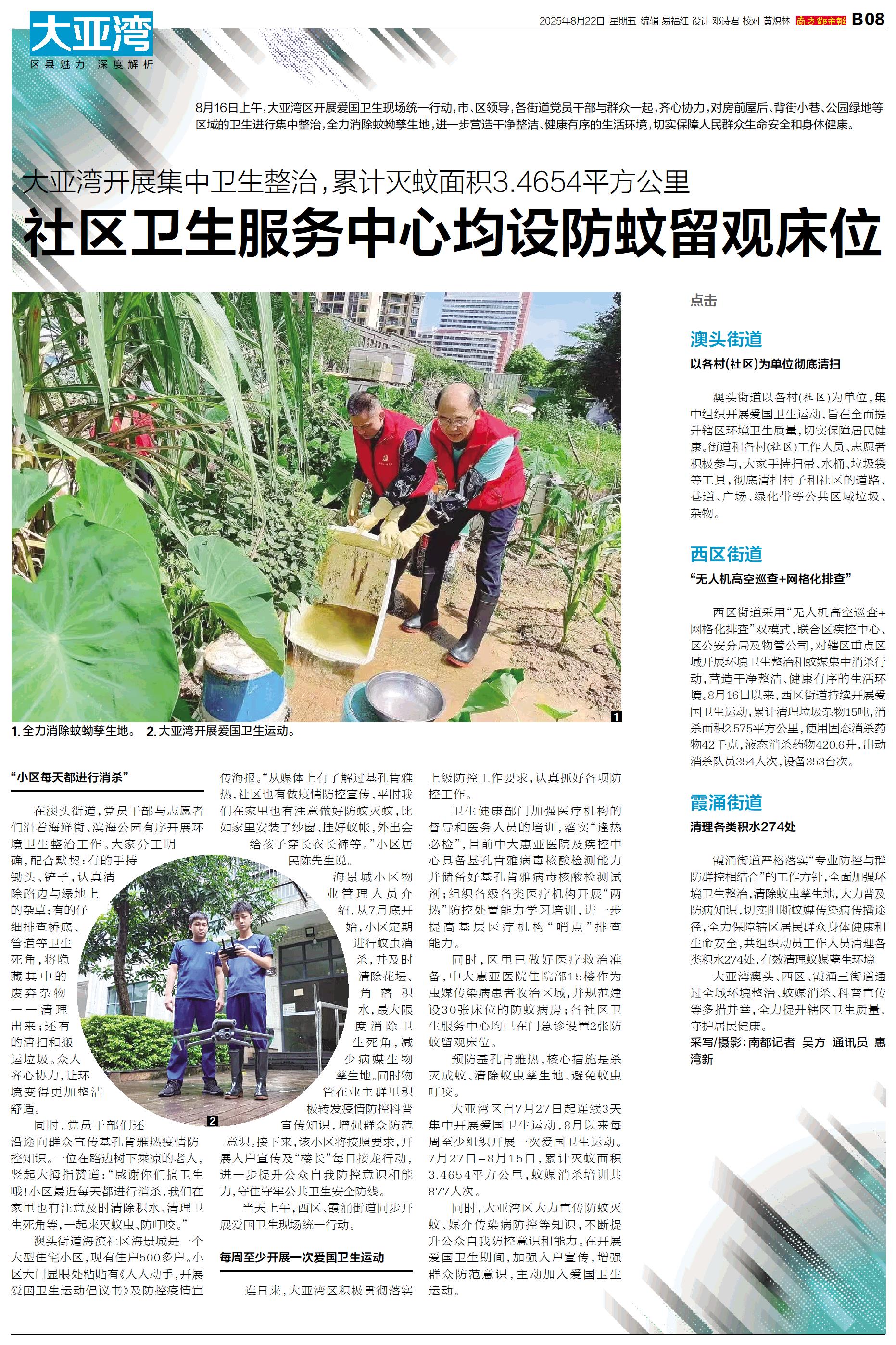 8月16日上午,大亚湾区开展爱国卫生现场统一行动,市、区领导,各街道党员干部与群众一起,齐心协力,对房前屋后、背街小巷、公园绿地等区域的卫生进行集中整治,全力消除蚊蚴孳生地,进一步营造干净整洁、健