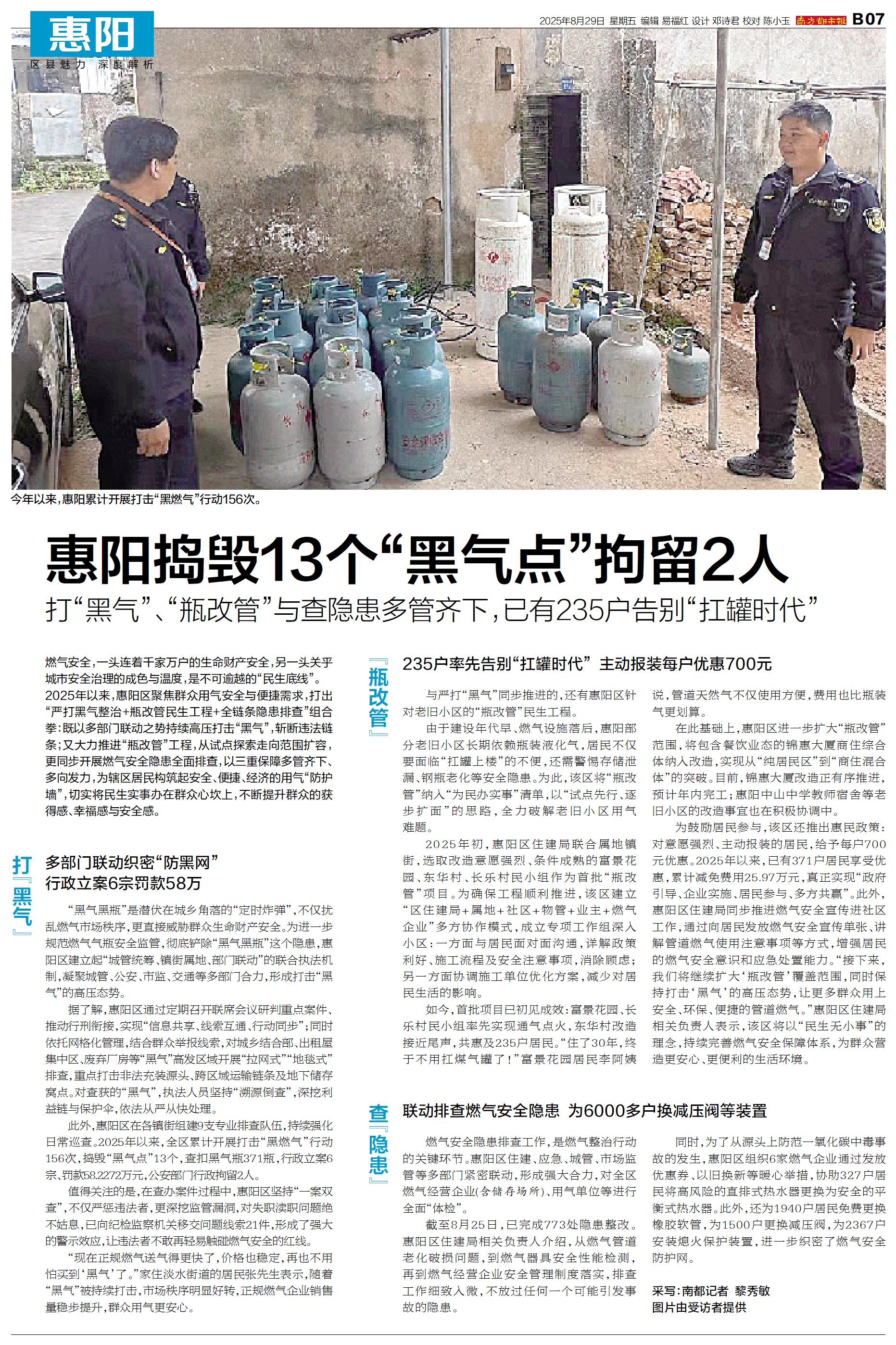 燃气安全,一头连着千家万户的生命财产安全,另一头关乎城市安全治理的成色与温度,是不可逾越的“民生底线”。 2025年以来,惠阳区聚焦群众用气安全与便捷需求,打出“严打黑气整治+瓶改管民生工程+全