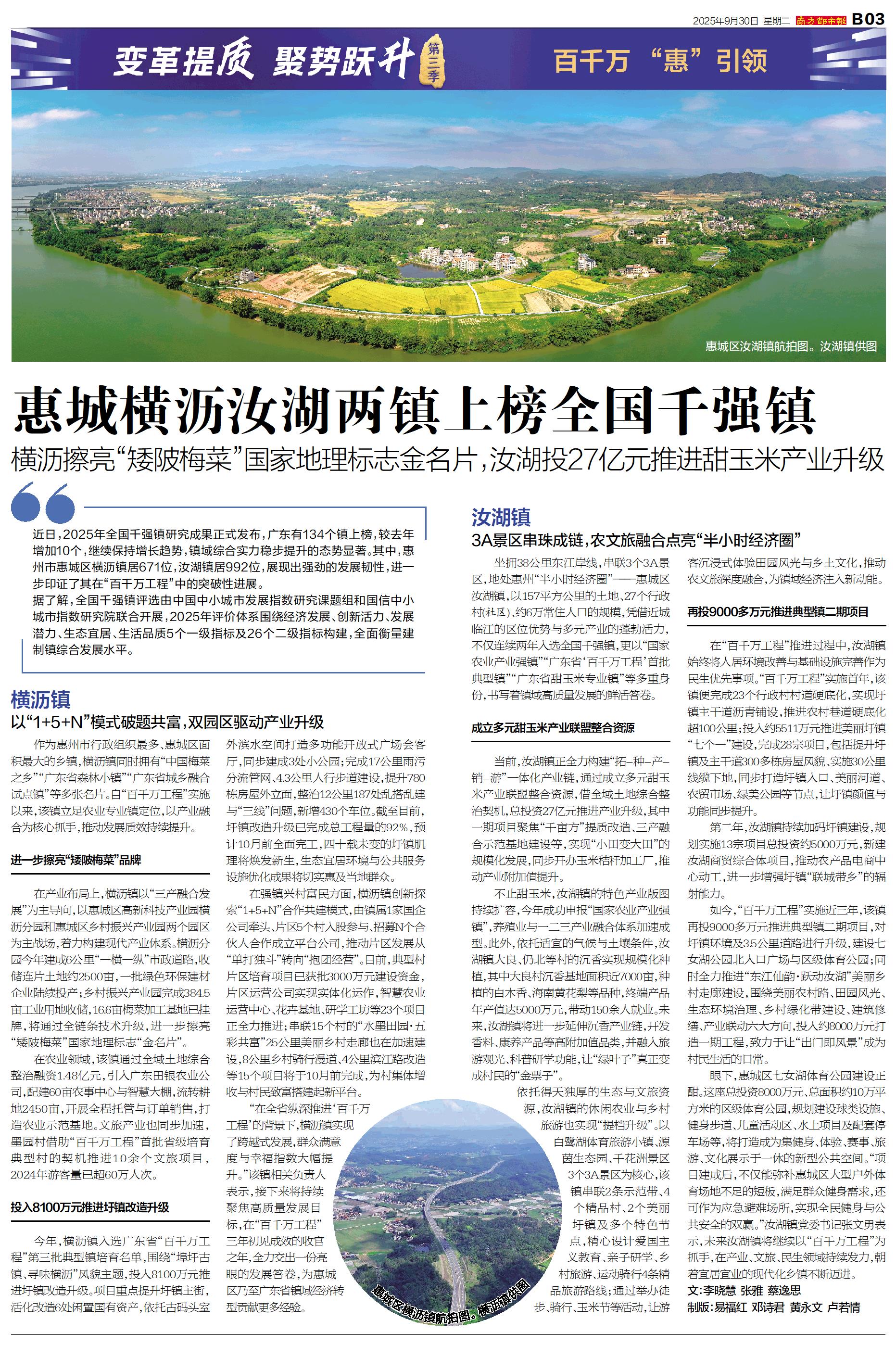 近日,2025年全国千强镇研究成果正式发布,广东有134个镇上榜,较去年增加10个,继续保持增长趋势,镇域综合实力稳步提升的态势显著。其中,惠州市惠城区横沥镇居671位,汝湖镇居992位,展现出强