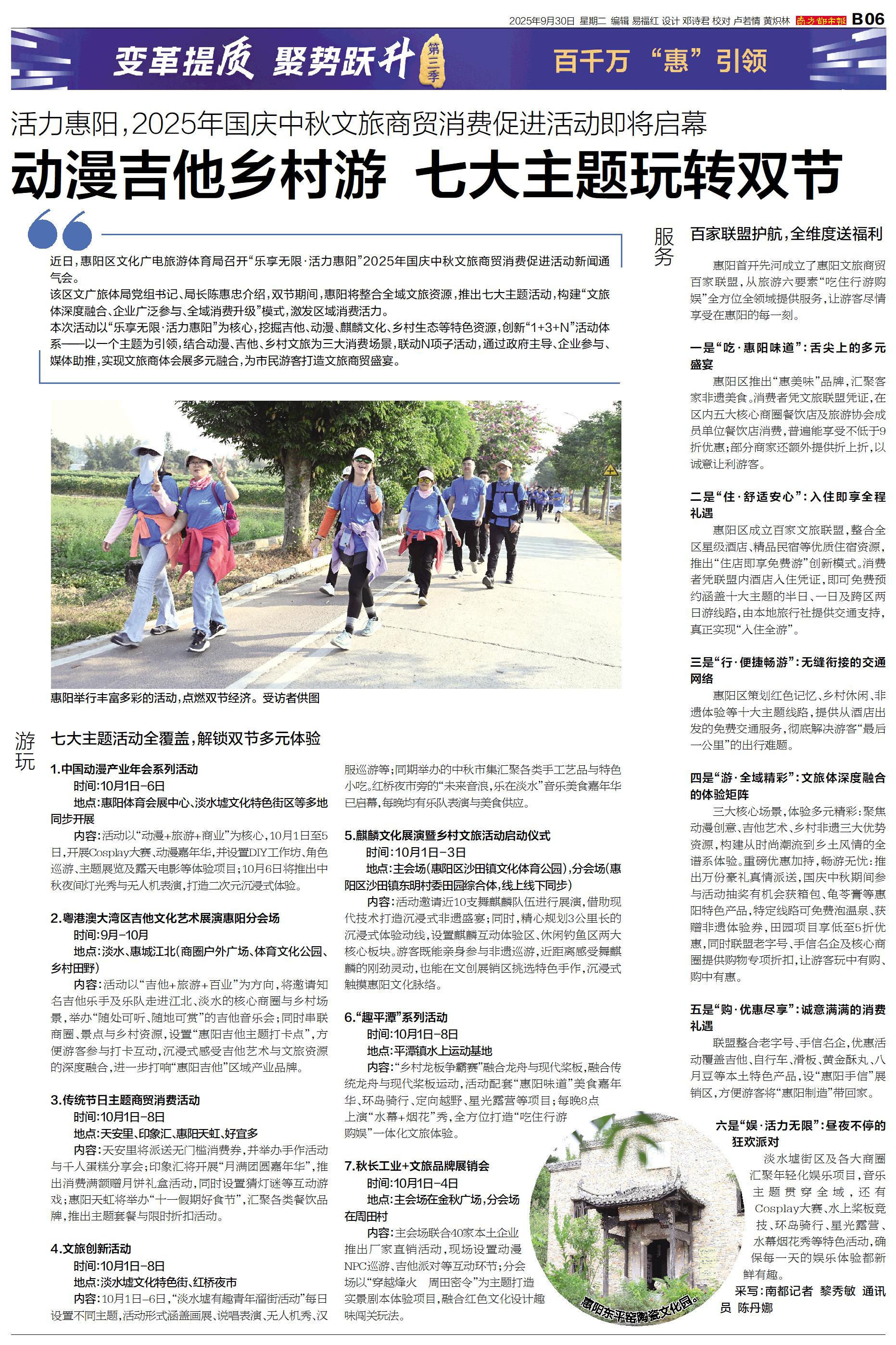 近日,惠阳区文化广电旅游体育局召开“乐享无限·活力惠阳”2025年国庆中秋文旅商贸消费促进活动新闻通气会。 该区文广旅体局党组书记、局长陈惠忠介绍,双节期间,惠阳将整合全域文旅资源,推出七大主题