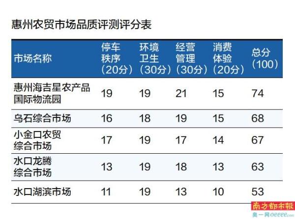 测评结果显示,惠州海吉星农产品国际物流园以74分位居榜首,水口湖滨市场以53分处于垫底位置。5家市场存在卫生处理不及时、局部环境脏乱等共性问题,部分市场还有电子秤未按规定定期检定、水产档口涉嫌使用“鬼秤”等计量违规情况。