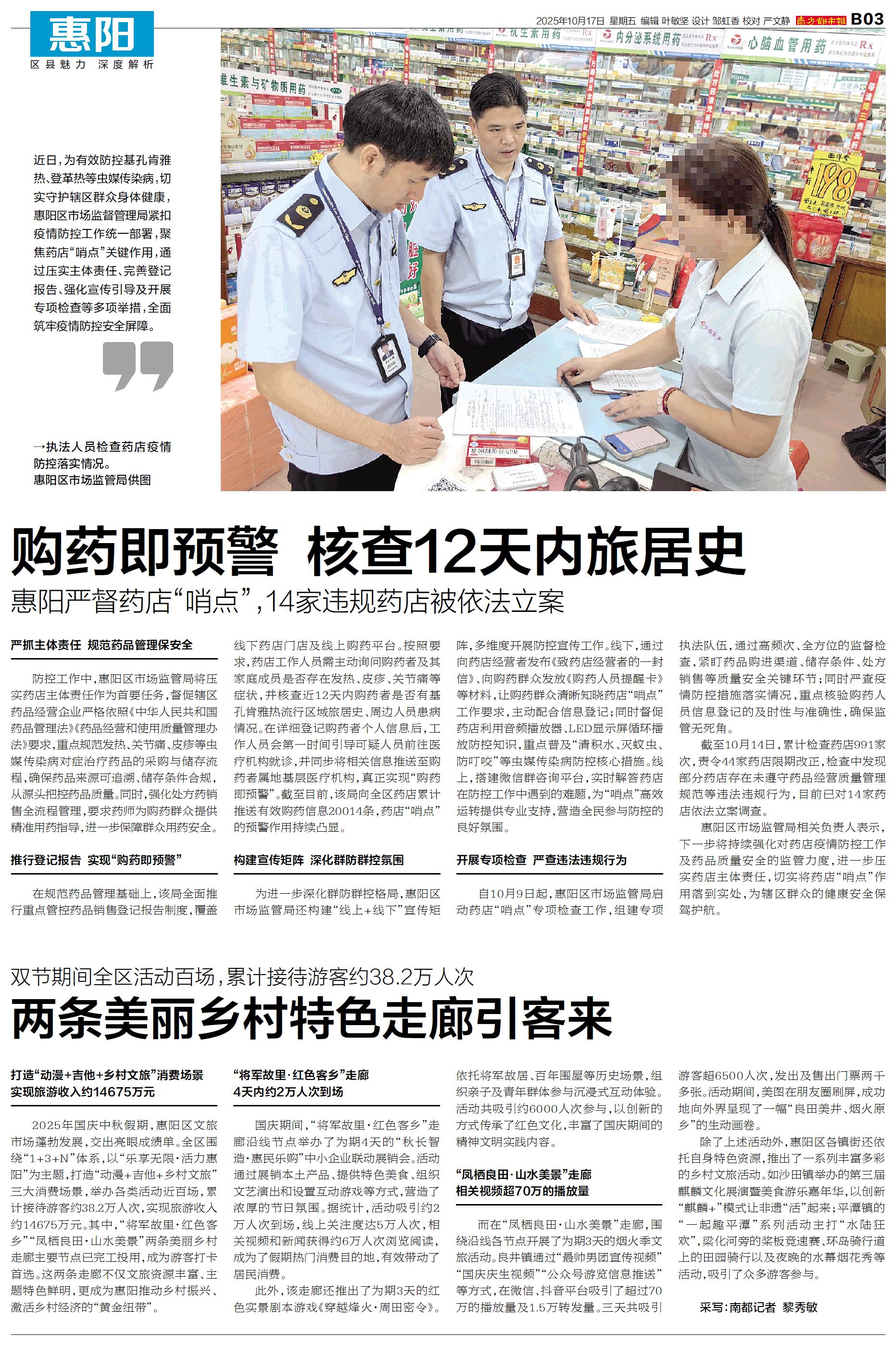 近日,为有效防控基孔肯雅热、登革热等虫媒传染病,切实守护辖区群众身体健康,惠阳区市场监督管理局紧扣疫情防控工作统一部署,聚焦药店“哨点”关键作用,通过压实主体责任、完善登记报告、强化宣传引导及开展