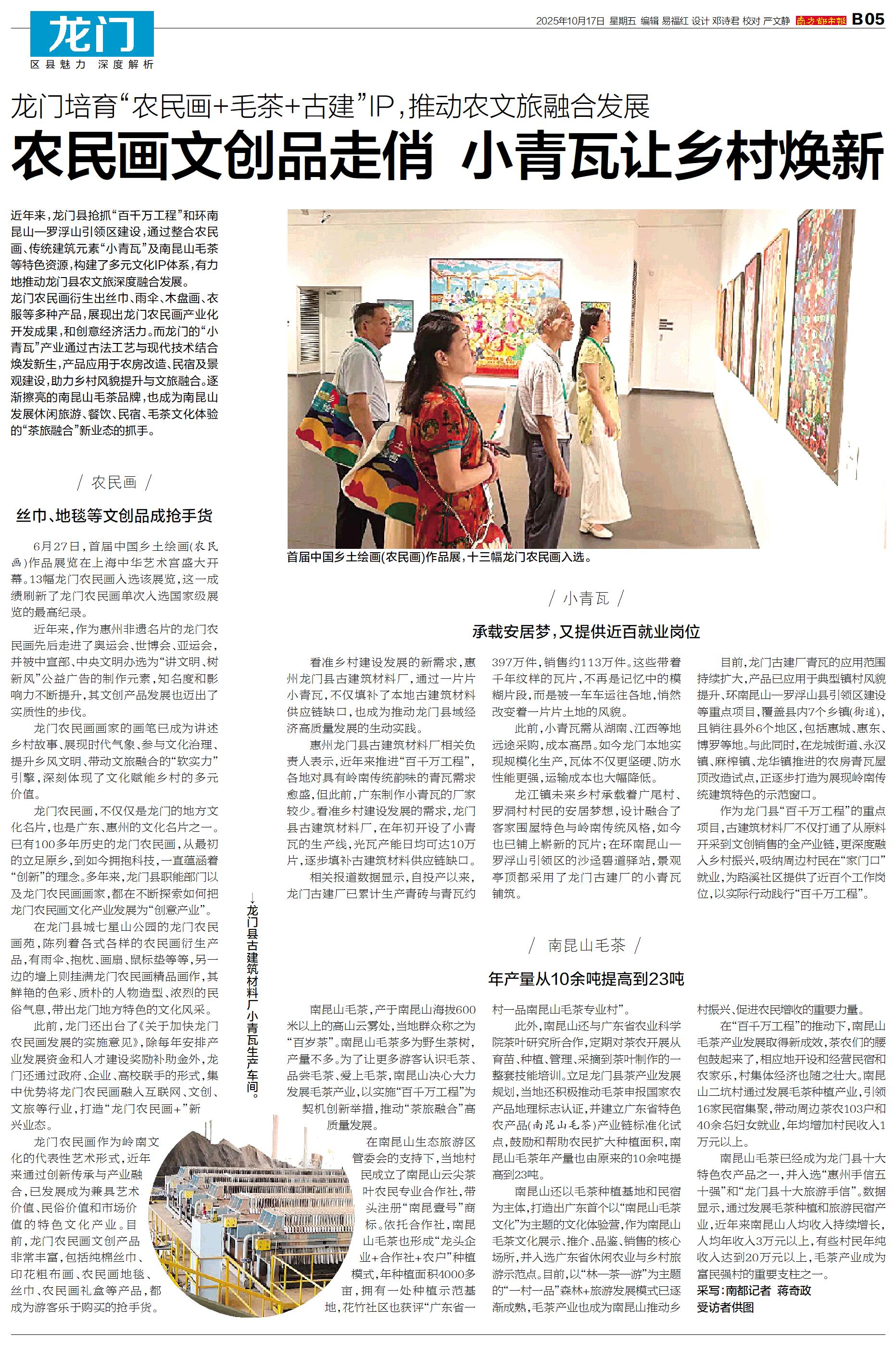 近年来,龙门县抢抓“百千万工程”和环南昆山—罗浮山引领区建设,通过整合农民画、传统建筑元素“小青瓦”及南昆山毛茶等特色资源,构建了多元文化IP体系,有力地推动龙门县农文旅深度融合发展。 龙门农民