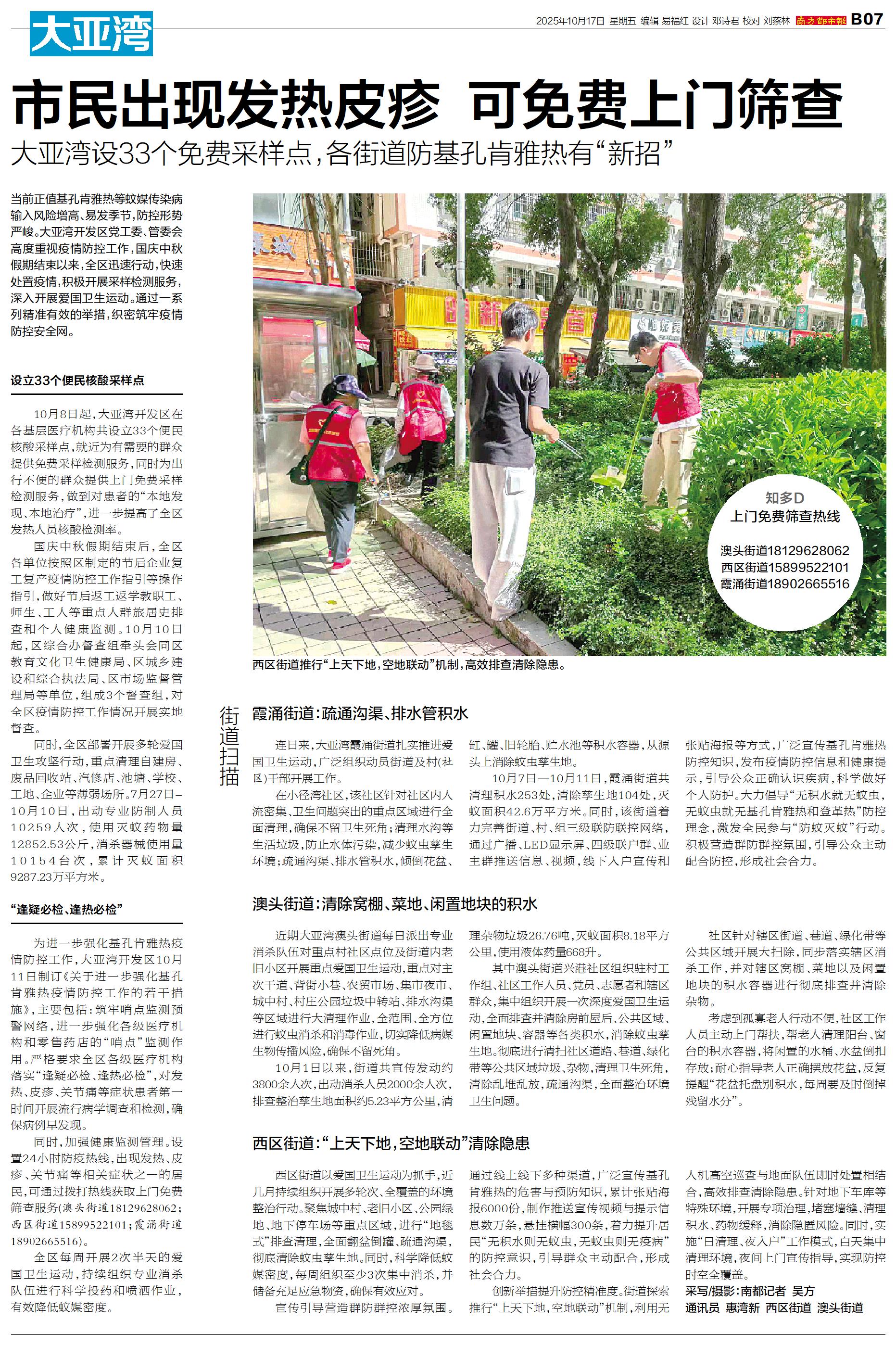 当前正值基孔肯雅热等蚊媒传染病输入风险增高、易发季节,防控形势严峻。大亚湾开发区党工委、管委会高度重视疫情防控工作,国庆中秋假期结束以来,全区迅速行动,快速处置疫情,积极开展采样检测服务,深入开展