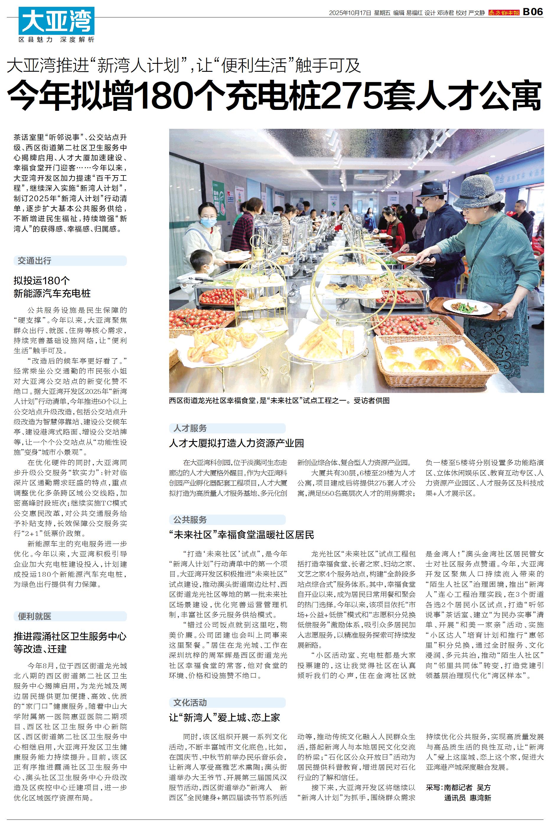茶话室里“听邻说事”、公交站点升级、西区街道第二社区卫生服务中心揭牌启用、人才大厦加速建设、幸福食堂开门迎客……今年以来,大亚湾开发区加力提速“百千万工程”,继续深入实施“新湾人计划”,制订202