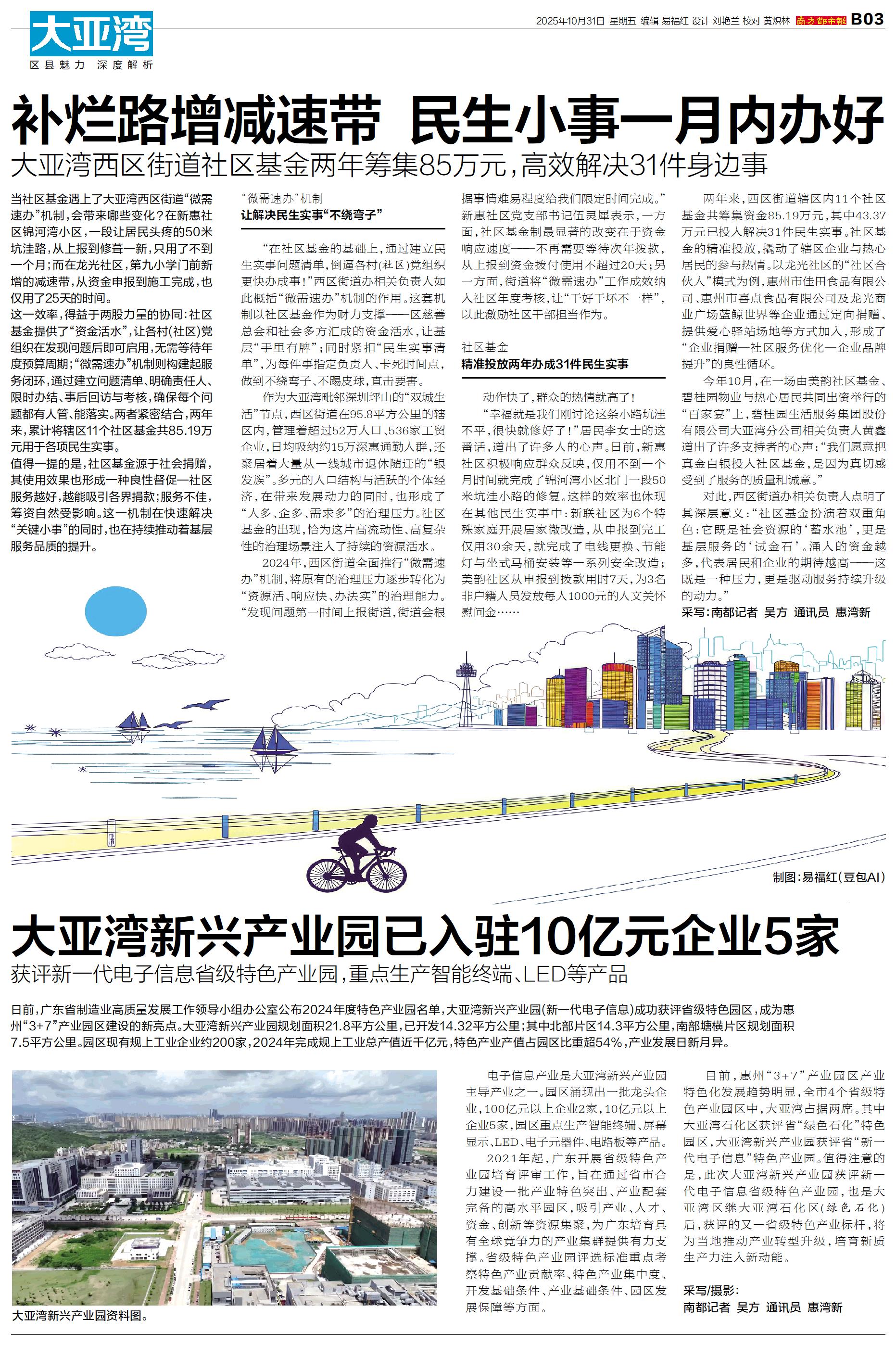 当社区基金遇上了大亚湾西区街道“微需速办”机制,会带来哪些变化?在新惠社区锦河湾小区,一段让居民头疼的50米坑洼路,从上报到修葺一新,只用了不到一个月;而在龙光社区,第九小学门前新增的减速带,从资