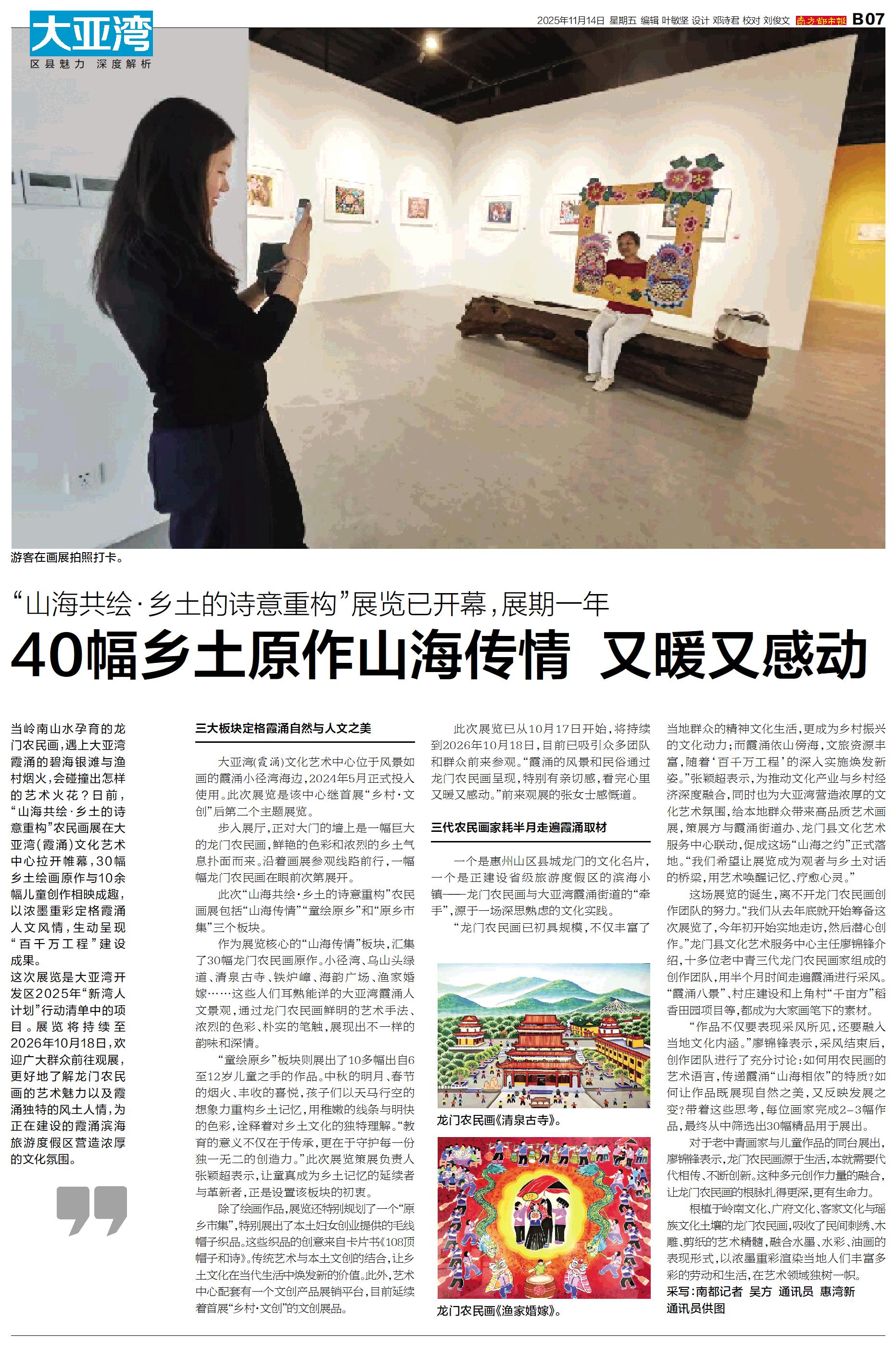 当岭南山水孕育的龙门农民画,遇上大亚湾霞涌的碧海银滩与渔村烟火,会碰撞出怎样的艺术火花?日前,“山海共绘·乡土的诗意重构”农民画展在大亚湾(霞涌)文化艺术中心拉开帷幕,30幅乡土绘画原作与10余幅