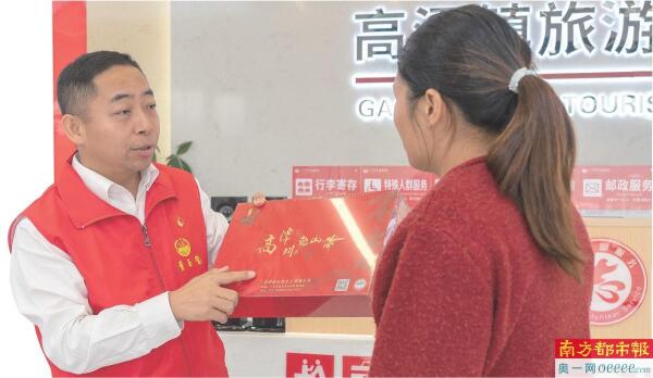 董玉玺在高潭旅游服务区向群众介绍土特产。