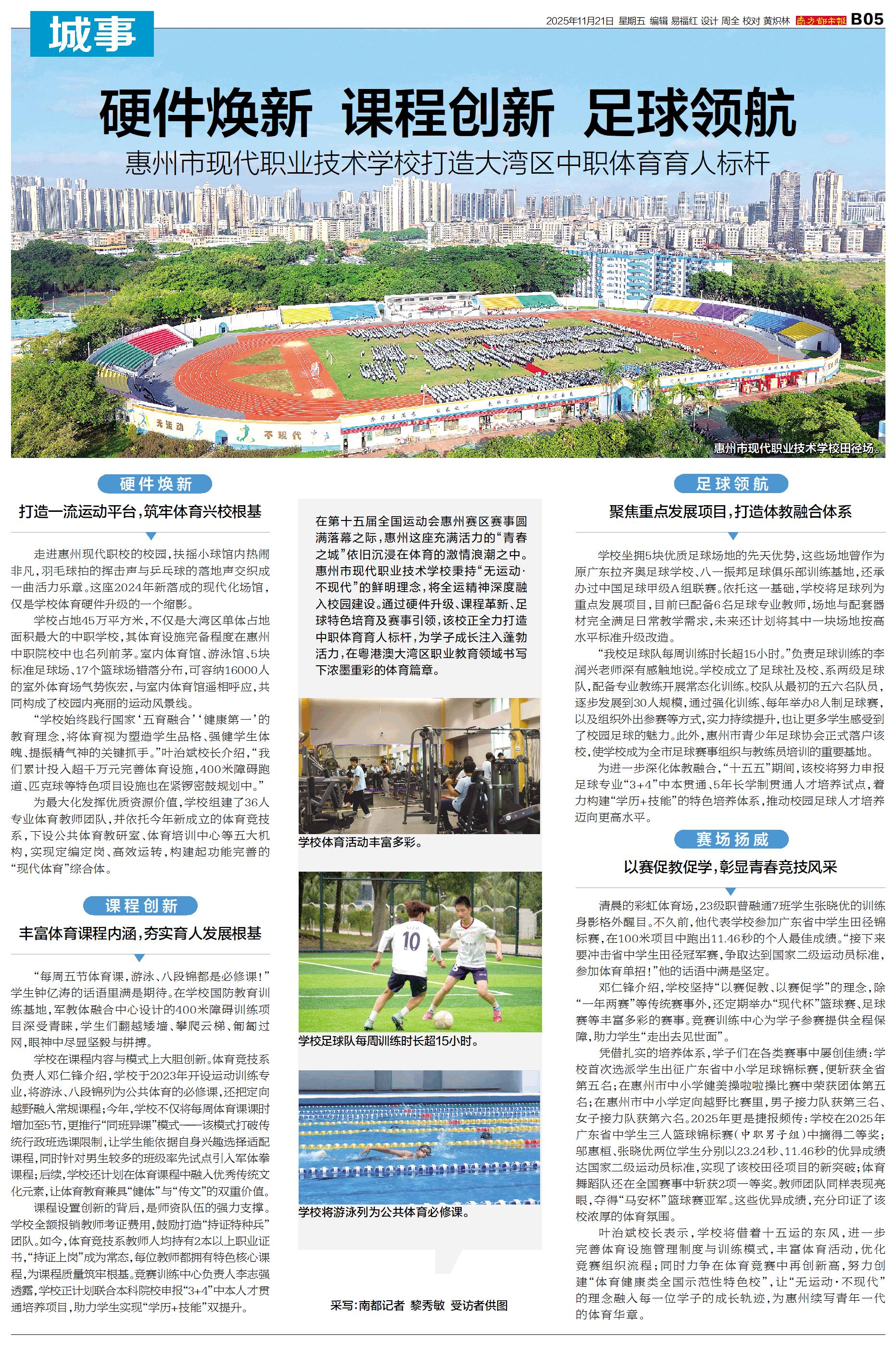 在第十五届全国运动会惠州赛区赛事圆满落幕之际,惠州这座充满活力的“青春之城”依旧沉浸在体育的激情浪潮之中。惠州市现代职业技术学校秉持“无运动·不现代”的鲜明理念,将全运精神深度融入校园建设。通过硬