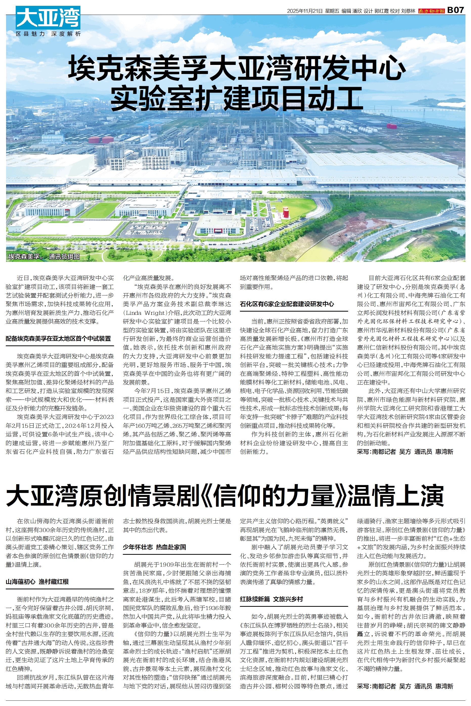 近日,埃克森美孚大亚湾研发中心实验室扩建项目动工,该项目将新建一套工艺试验装置并配套测试分析能力,进一步聚焦市场需求,加快科技成果转化应用,为惠州培育发展新质生产力、推动石化产业高质量发展提供高效