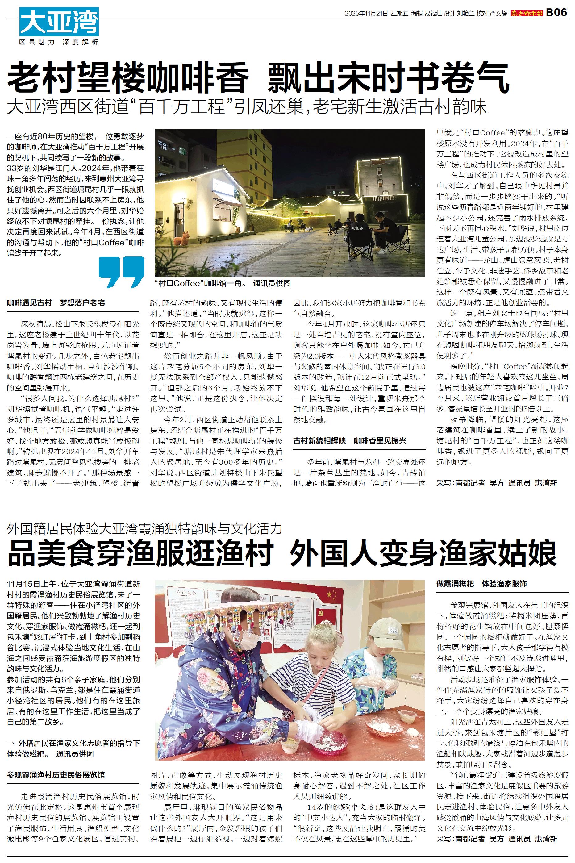 11月15日上午,位于大亚湾霞涌街道新村村的霞涌渔村历史民俗展览馆,来了一群特殊的游客——住在小径湾社区的外国籍居民。他们兴致勃勃地了解渔村历史文化、穿渔家服饰、做霞涌糍粑,还一起到包禾塘“彩虹屋