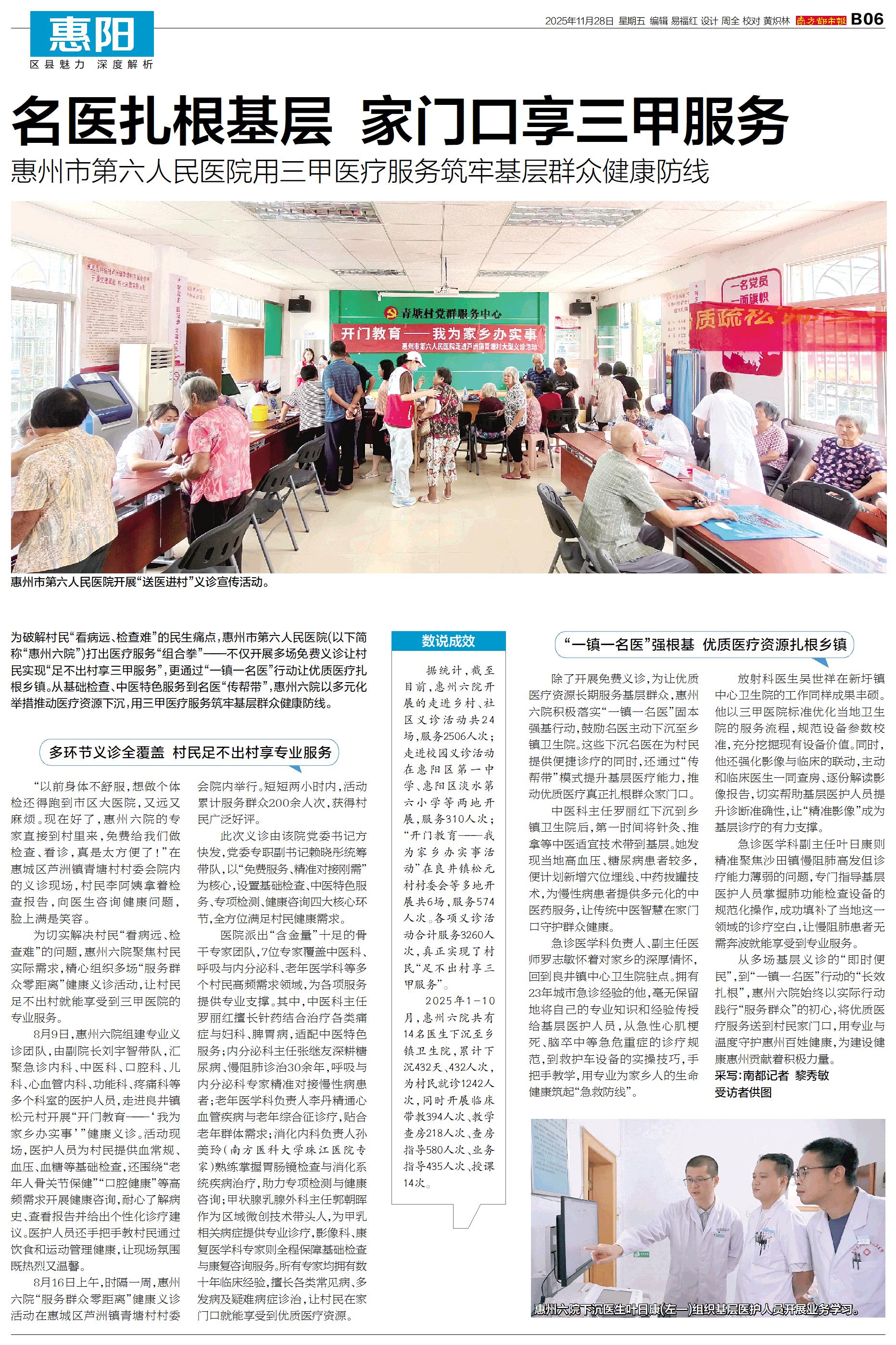 为破解村民“看病远、检查难”的民生痛点,惠州市第六人民医院(以下简称“惠州六院”)打出医疗服务“组合拳”——不仅开展多场免费义诊让村民实现“足不出村享三甲服务”,更通过“一镇一名医”行动让优质医疗