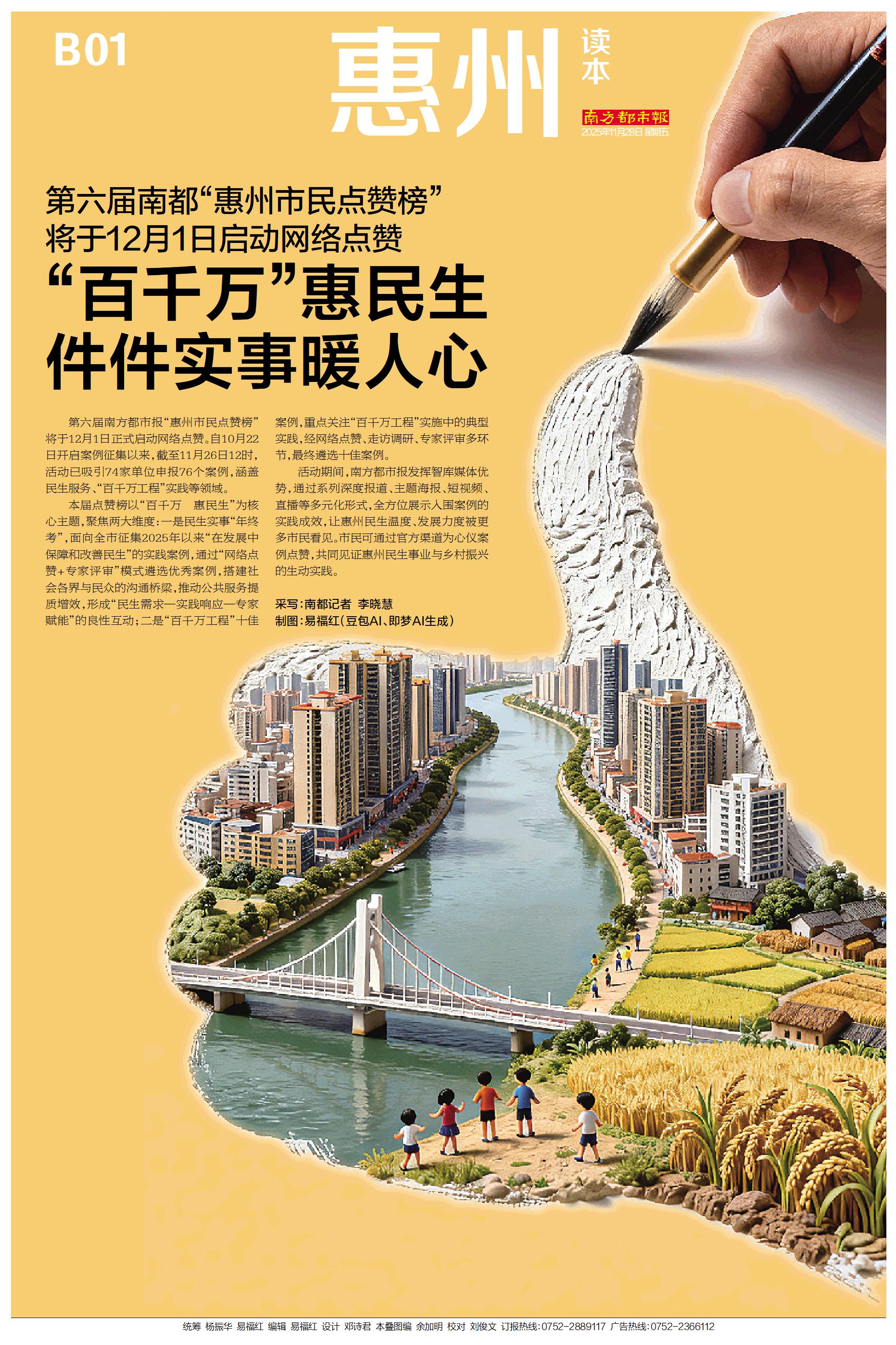 第六届南方都市报“惠州市民点赞榜”将于12月1日正式启动网络点赞。自10月22日开启案例征集以来,截至11月26日12时,活动已吸引74家单位申报76个案例,涵盖民生服务、“百千万工程”实践等领域