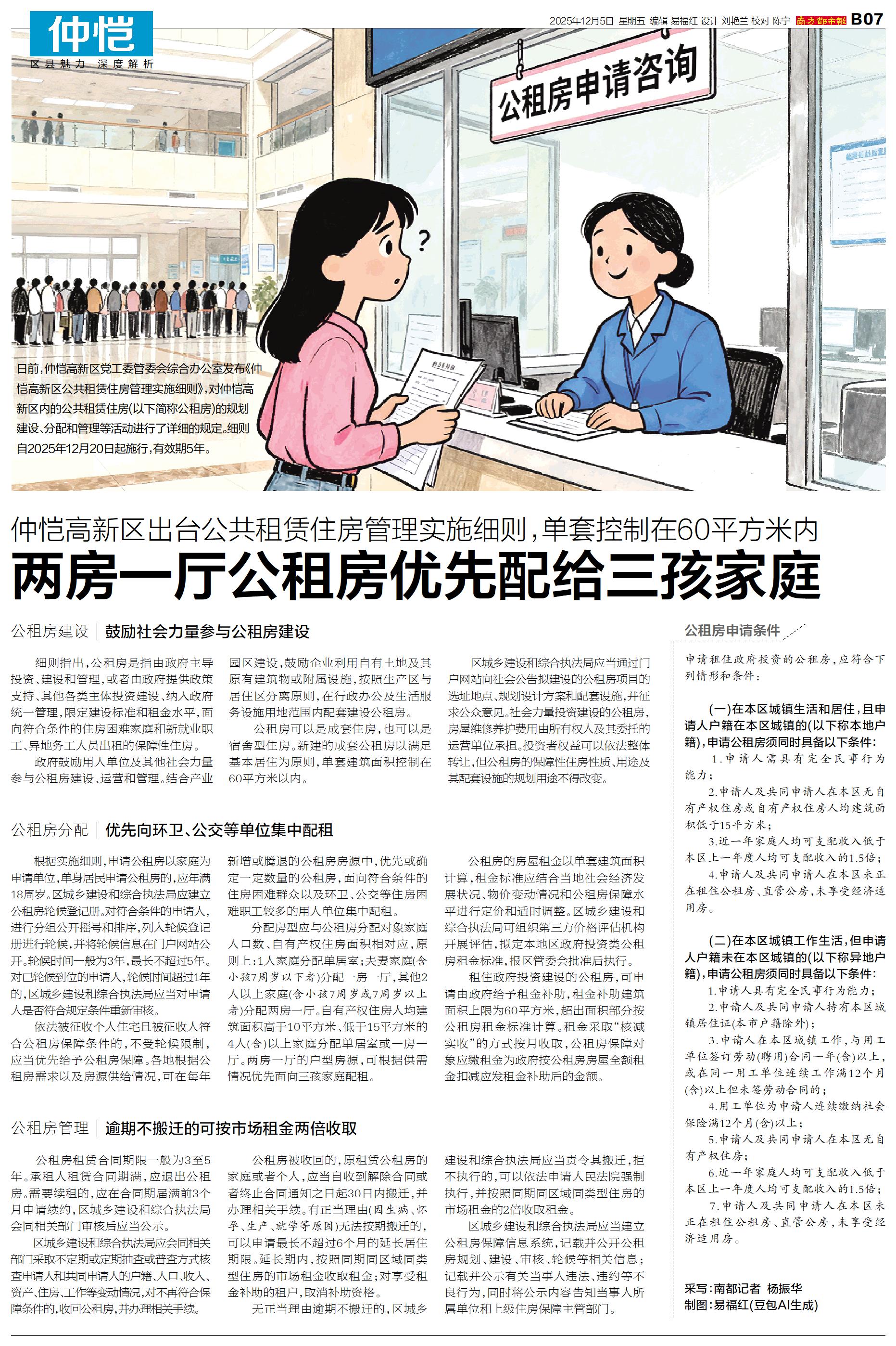 日前,仲恺高新区党工委管委会综合办公室发布《仲恺高新区公共租赁住房管理实施细则》,对仲恺高新区内的公共租赁住房(以下简称公租房)的规划建设、分配和管理等活动进行了详细的规定。细则自2025年12月