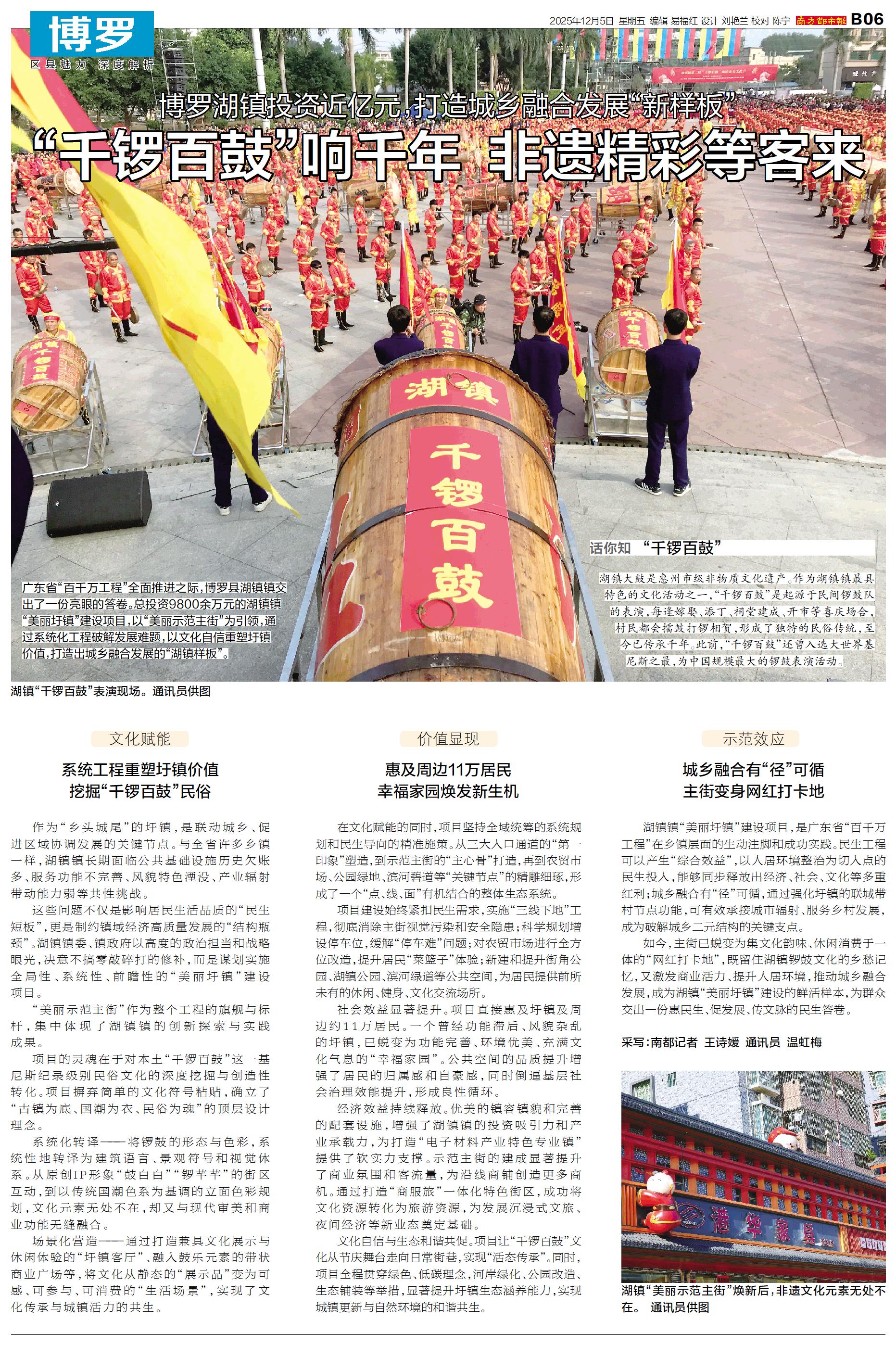 广东省“百千万工程”全面推进之际,博罗县湖镇镇交出了一份亮眼的答卷。总投资9800余万元的湖镇镇“美丽圩镇”建设项目,以“美丽示范主街”为引领,通过系统化工程破解发展难题,以文化自信重塑圩镇价值,