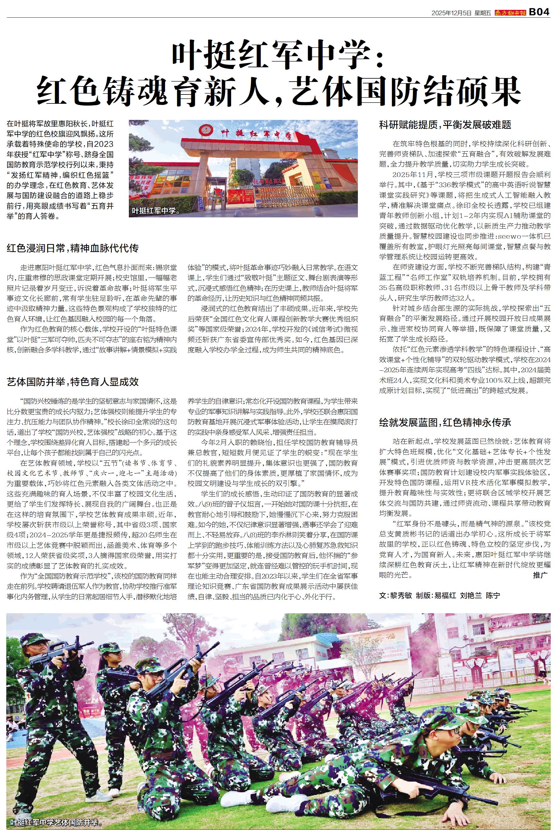 叶挺红军中学:红色铸魂育新人,艺体国防结硕果