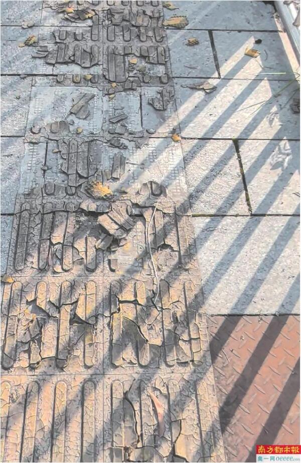 日前,南都记者对花边岭周边人行道走访发现,盲道实现全覆盖,但损坏状况严重,环花边岭一周不足两公里,每走一段就会看到盲道损坏的情况。有的地方盲道缺砖,日久成坑,深四五厘米,一脚踏入,常人也很容易绊倒,对于盲人则存在严重安全隐患。