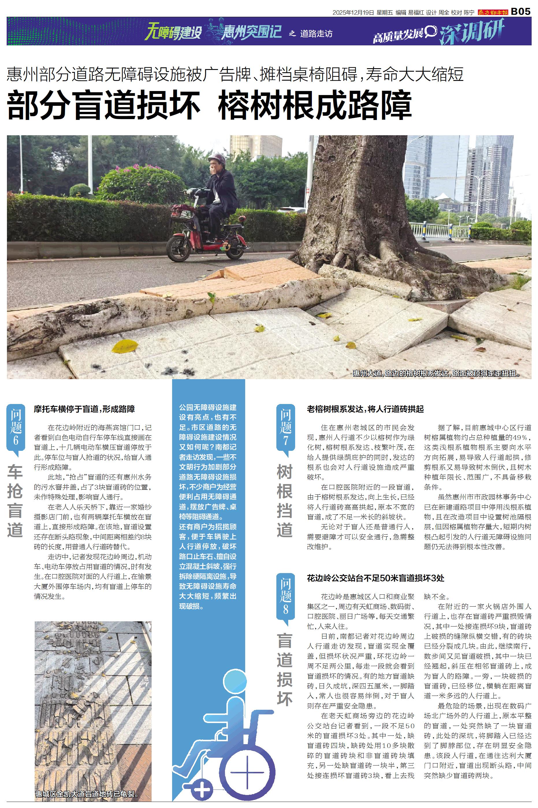 道路走访 公园无障碍设施建设有亮点,也有不足。市区道路的无障碍设施建设情况又如何呢?南都记者走访发现,一些不文明行为加剧部分道路无障碍设施损坏,不少商户为经营便利占用无障碍通道,摆放广告牌、桌椅
