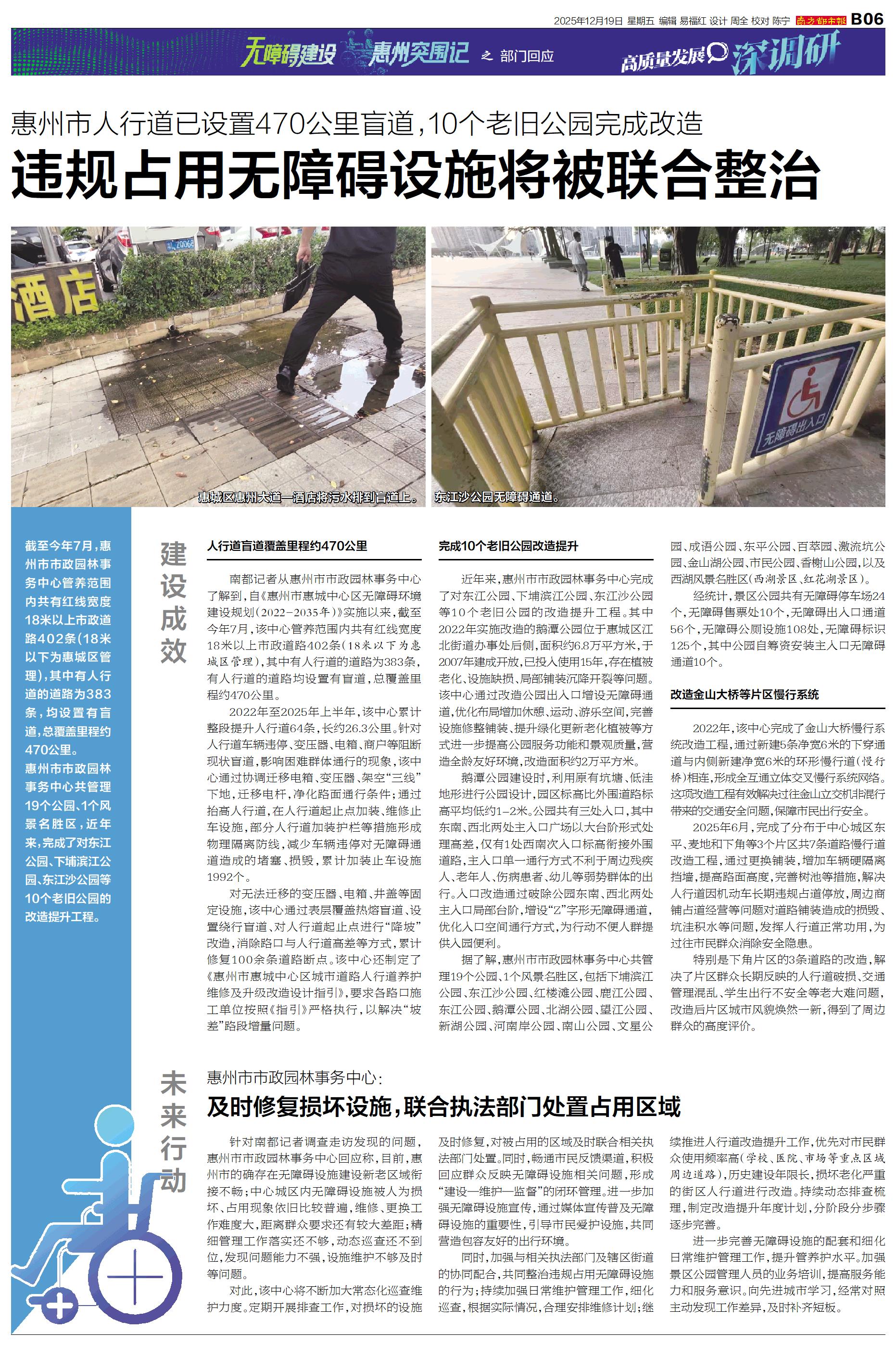 部门回应 截至今年7月,惠州市市政园林事务中心管养范围内共有红线宽度18米以上市政道路402条(18米以下为惠城区管理),其中有人行道的道路为383条,均设置有盲道,总覆盖里程约470公里。