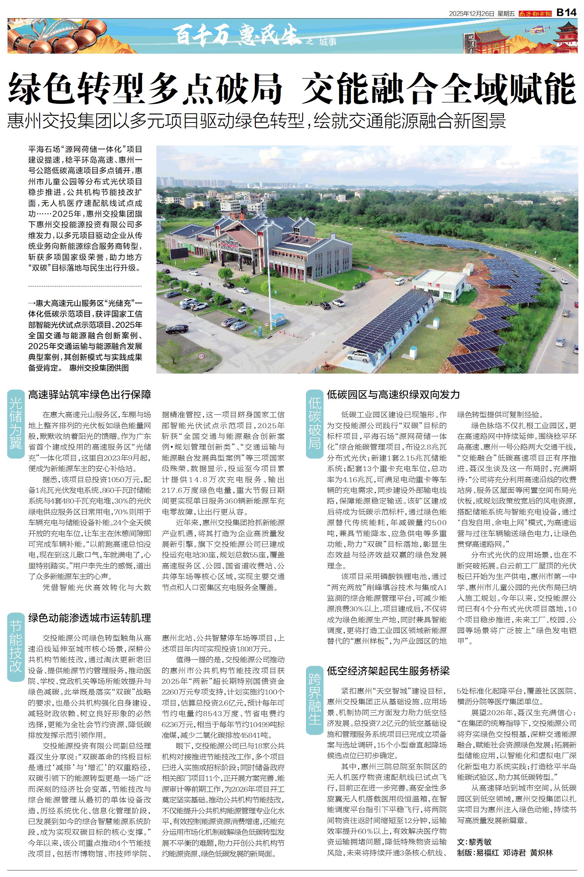 城事 平海石场“源网荷储一体化”项目建设提速,稔平环岛高速、惠州一号公路低碳高速项目多点铺开,惠州市儿童公园等分布式光伏项目稳步推进,公共机构节能技改扩面,无人机医疗速配航线试点成功……2025