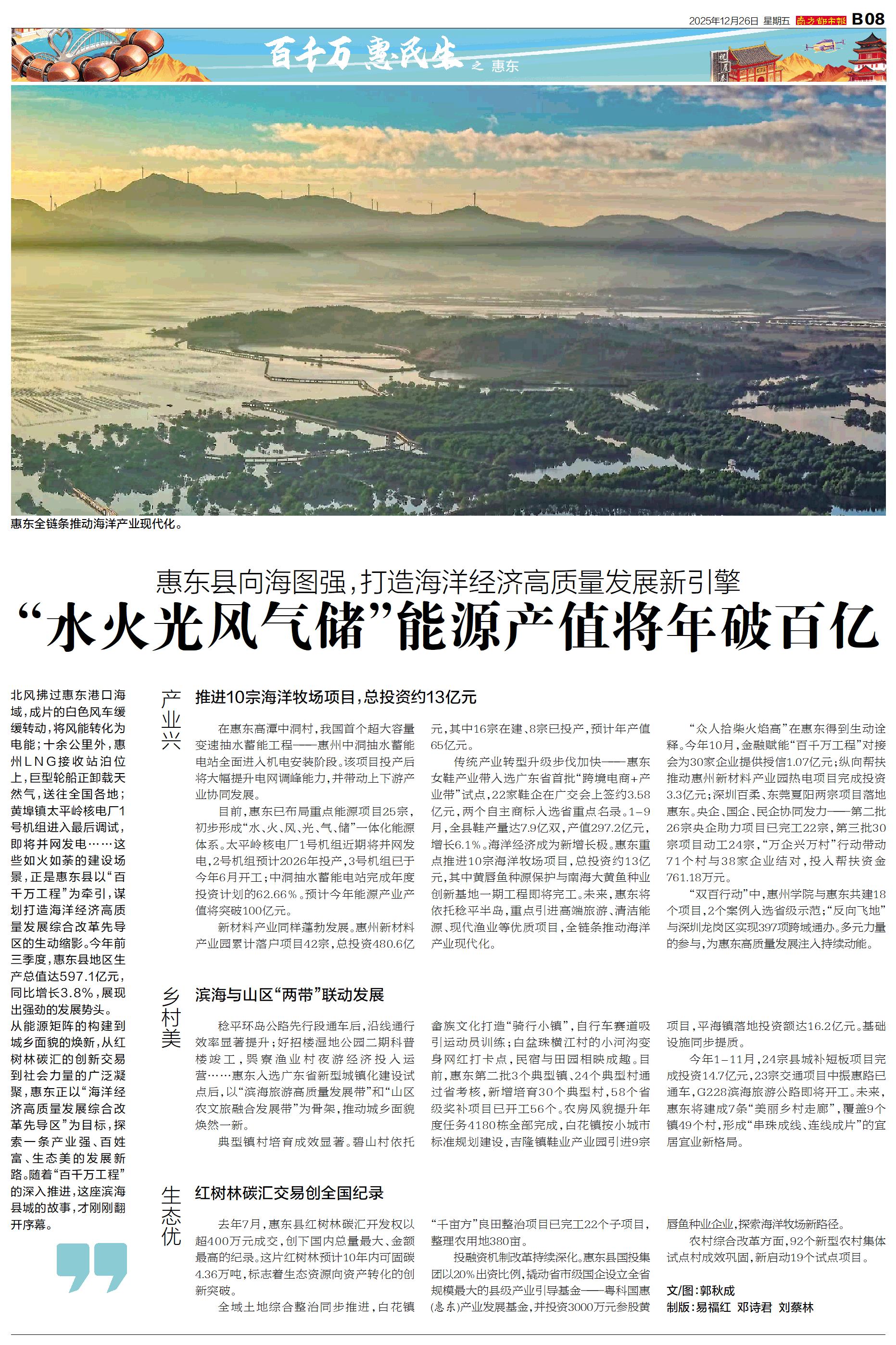 惠东 北风拂过惠东港口海域,成片的白色风车缓缓转动,将风能转化为电能;十余公里外,惠州LNG接收站泊位上,巨型轮船正卸载天然气,送往全国各地;黄埠镇太平岭核电厂1号机组进入最后调试,即将并网发电