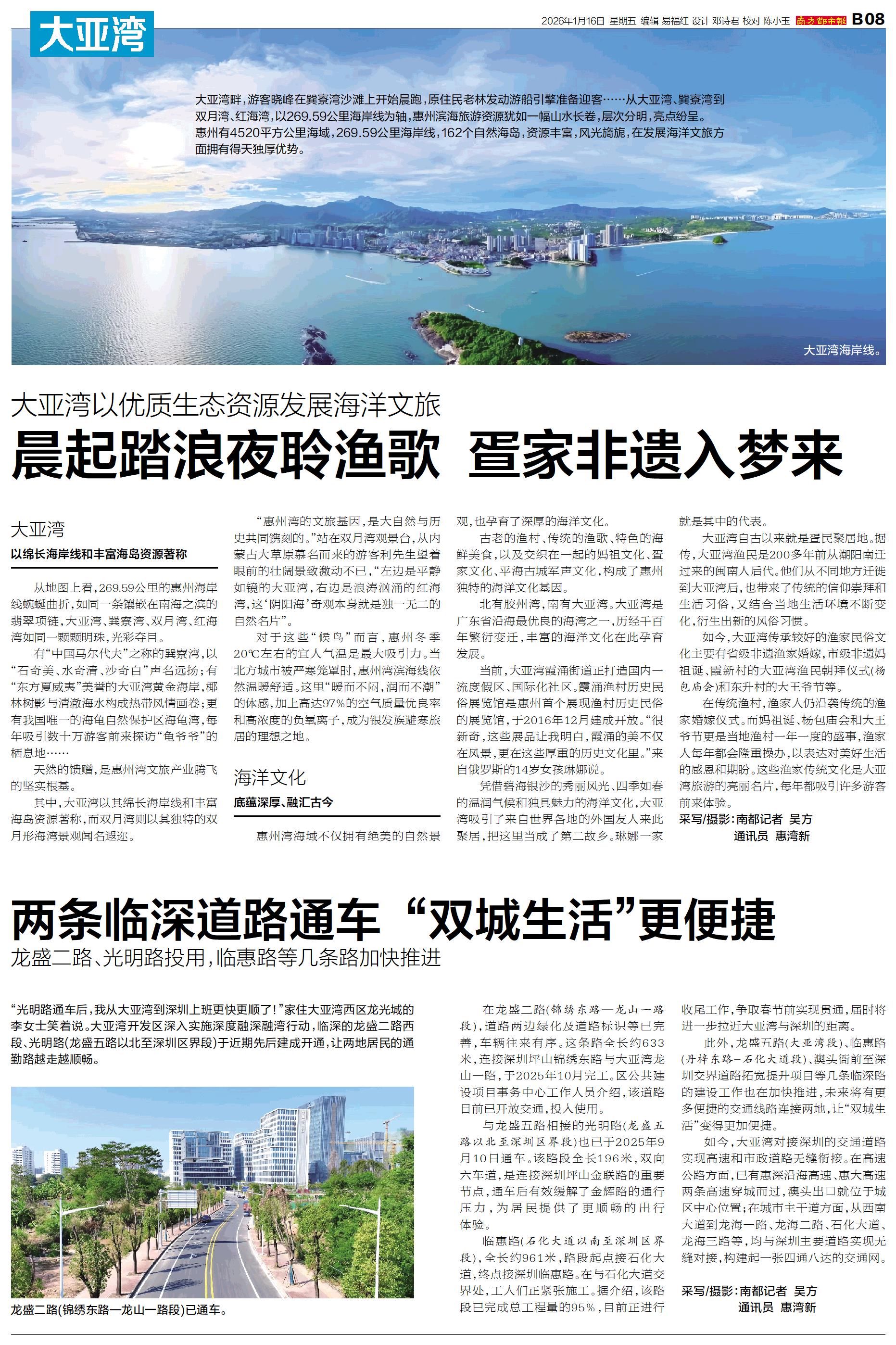 “光明路通车后,我从大亚湾到深圳上班更快更顺了!”家住大亚湾西区龙光城的李女士笑着说。大亚湾开发区深入实施深度融深融湾行动,临深的龙盛二路西段、光明路(龙盛五路以北至深圳区界段)于近期先后建成开通