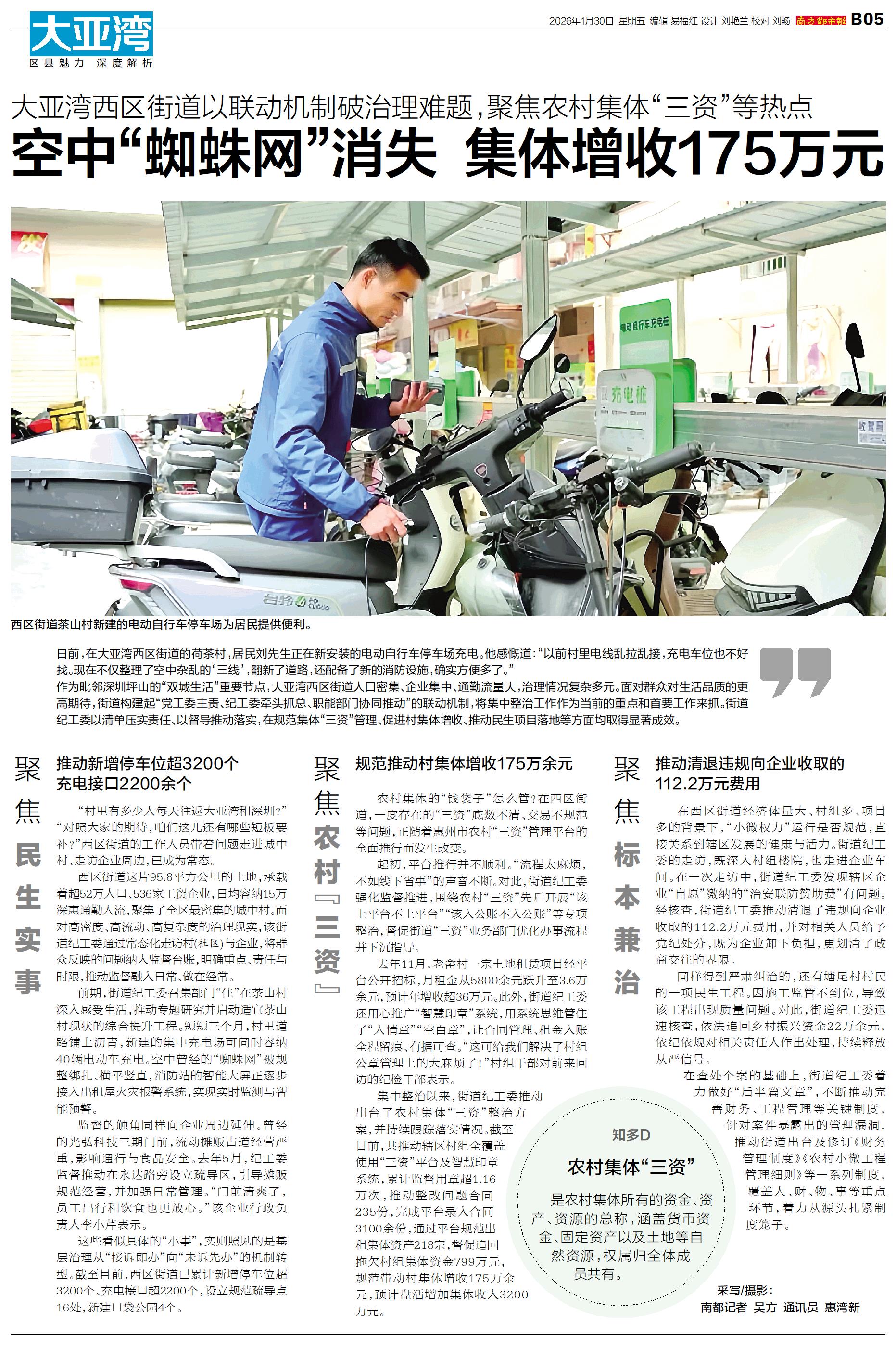 日前,在大亚湾西区街道的荷茶村,居民刘先生正在新安装的电动自行车停车场充电。他感慨道:“以前村里电线乱拉乱接,充电车位也不好找。现在不仅整理了空中杂乱的‘三线’,翻新了道路,还配备了新的消防设施,