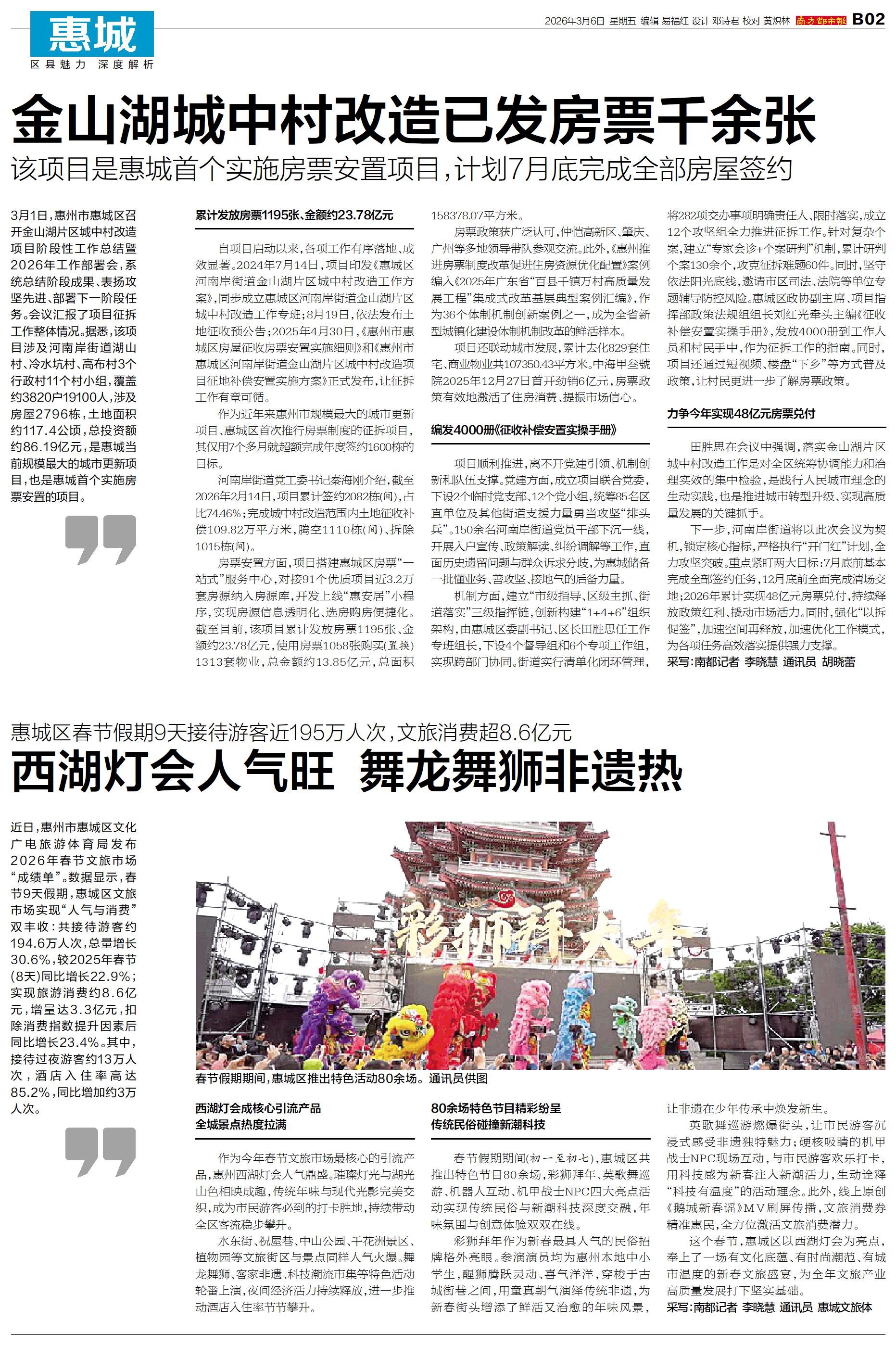 近日,惠州市惠城区文化广电旅游体育局发布2026年春节文旅市场“成绩单”。数据显示,春节9天假期,惠城区文旅市场实现“人气与消费”双丰收:共接待游客约194.6万人次,总量增长30.6%,较202