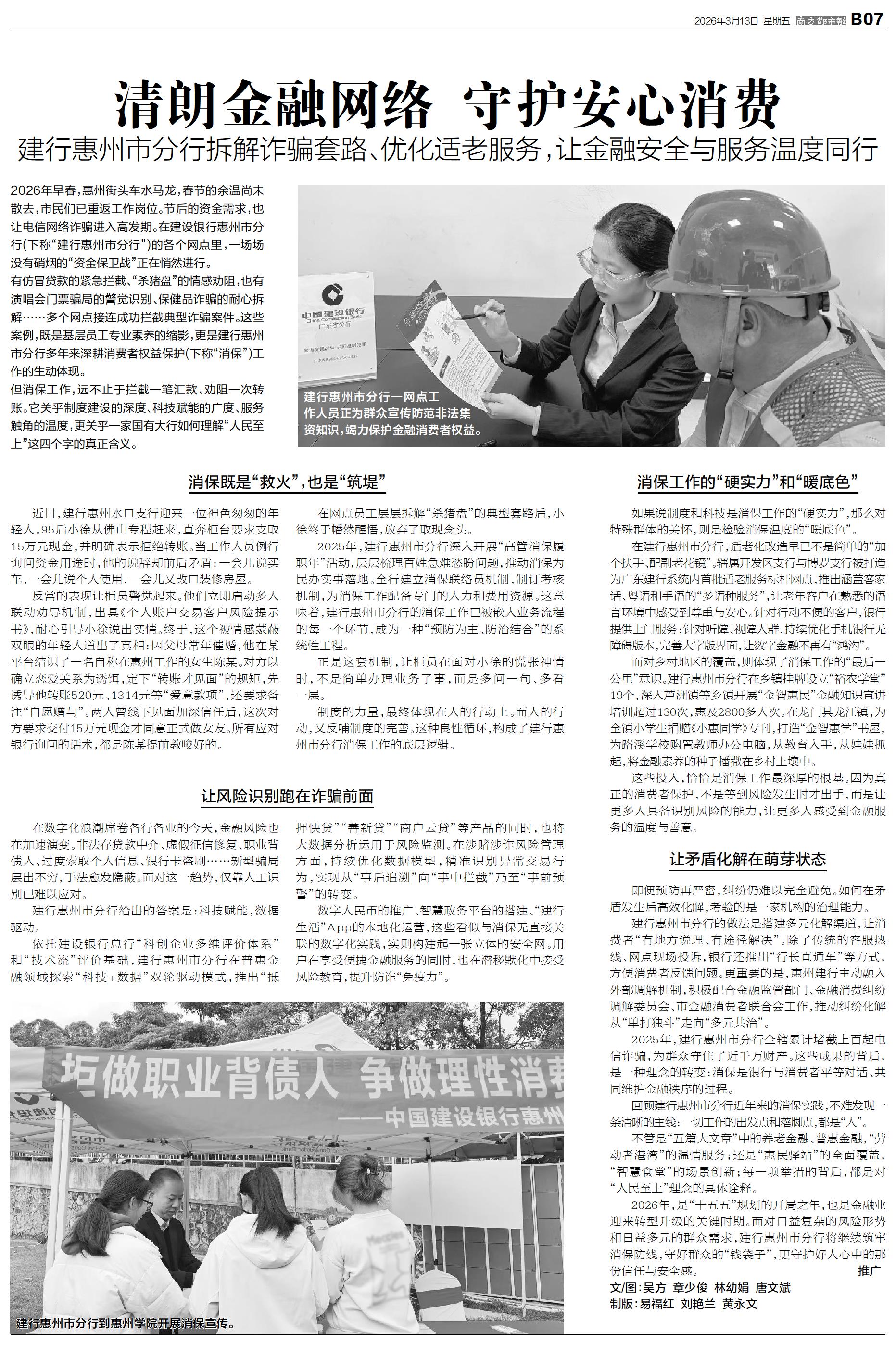 2026年早春,惠州街头车水马龙,春节的余温尚未散去,市民们已重返工作岗位。节后的资金需求,也让电信网络诈骗进入高发期。在建设银行惠州市分行(下称“建行惠州市分行”)的各个网点里,一场场没有硝烟的