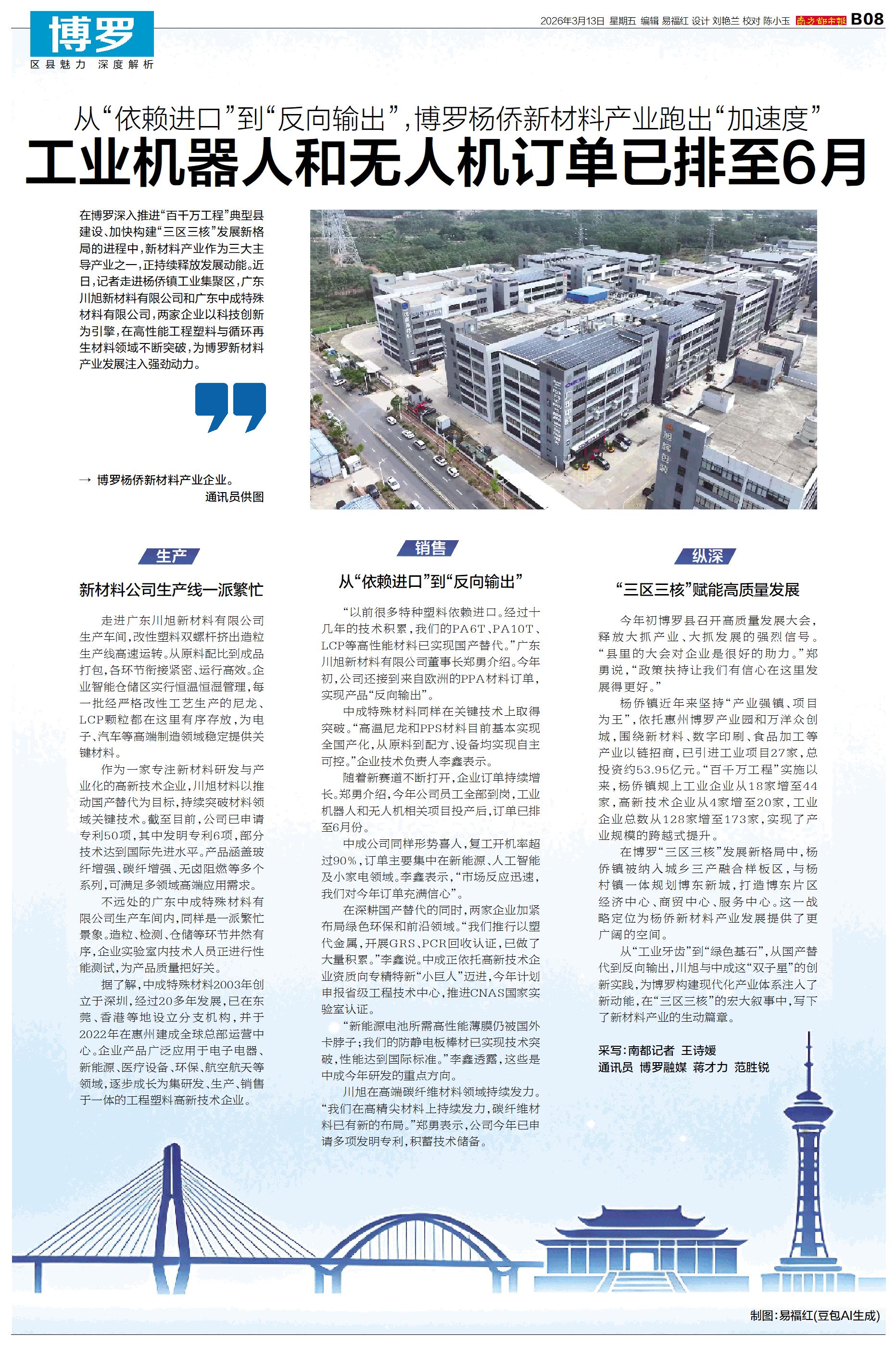 在博罗深入推进“百千万工程”典型县建设、加快构建“三区三核”发展新格局的进程中,新材料产业作为三大主导产业之一,正持续释放发展动能。近日,记者走进杨侨镇工业集聚区,广东川旭新材料有限公司和广东中成