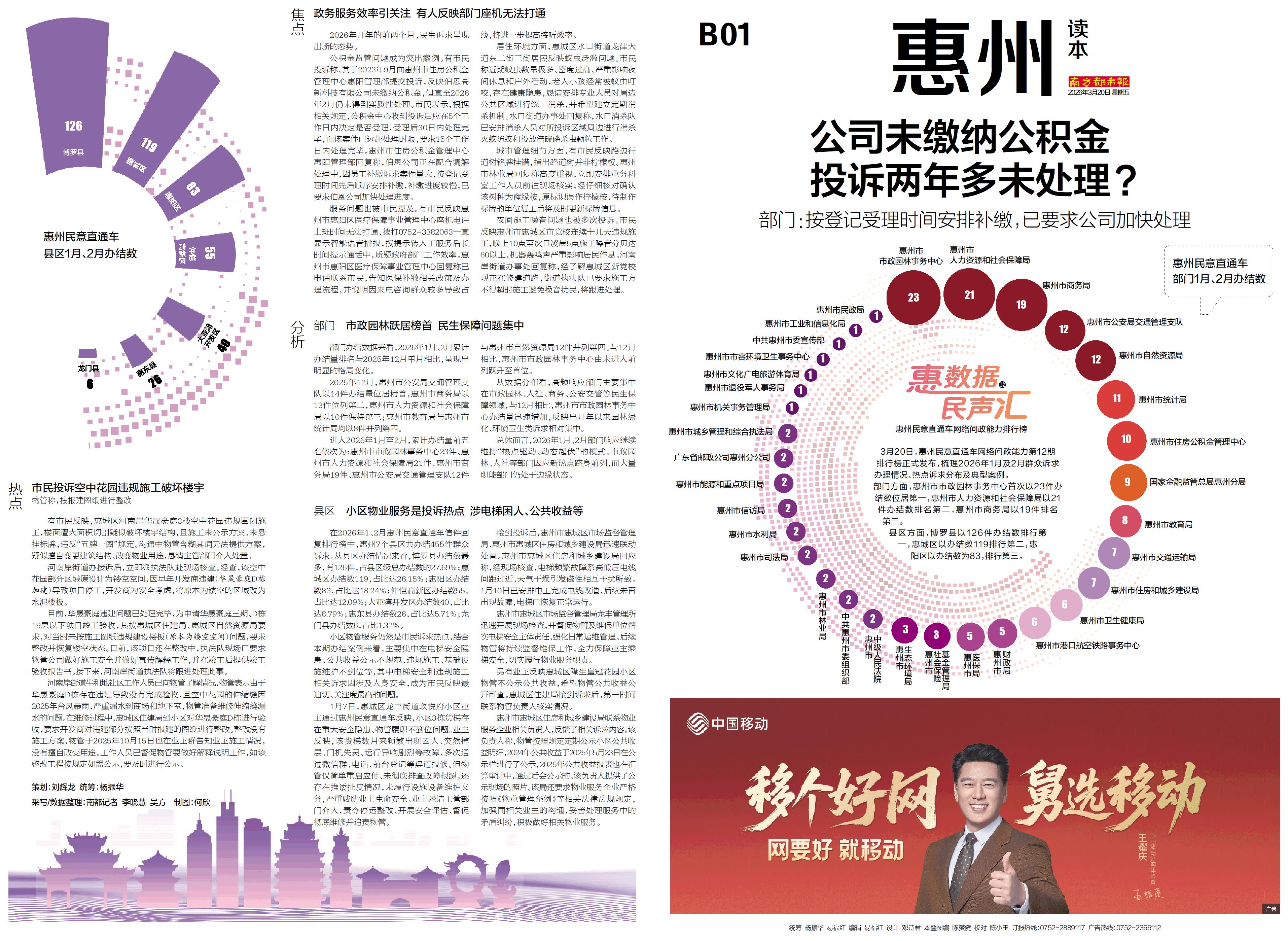 惠州民意直通车网络问政能力排行榜 3月20日,惠州民意直通车网络问政能力第12期排行榜正式发布,梳理2026年1月及2月群众诉求办理情况、热点诉求分布及典型案例。 部门方面,惠州市市政园林事务