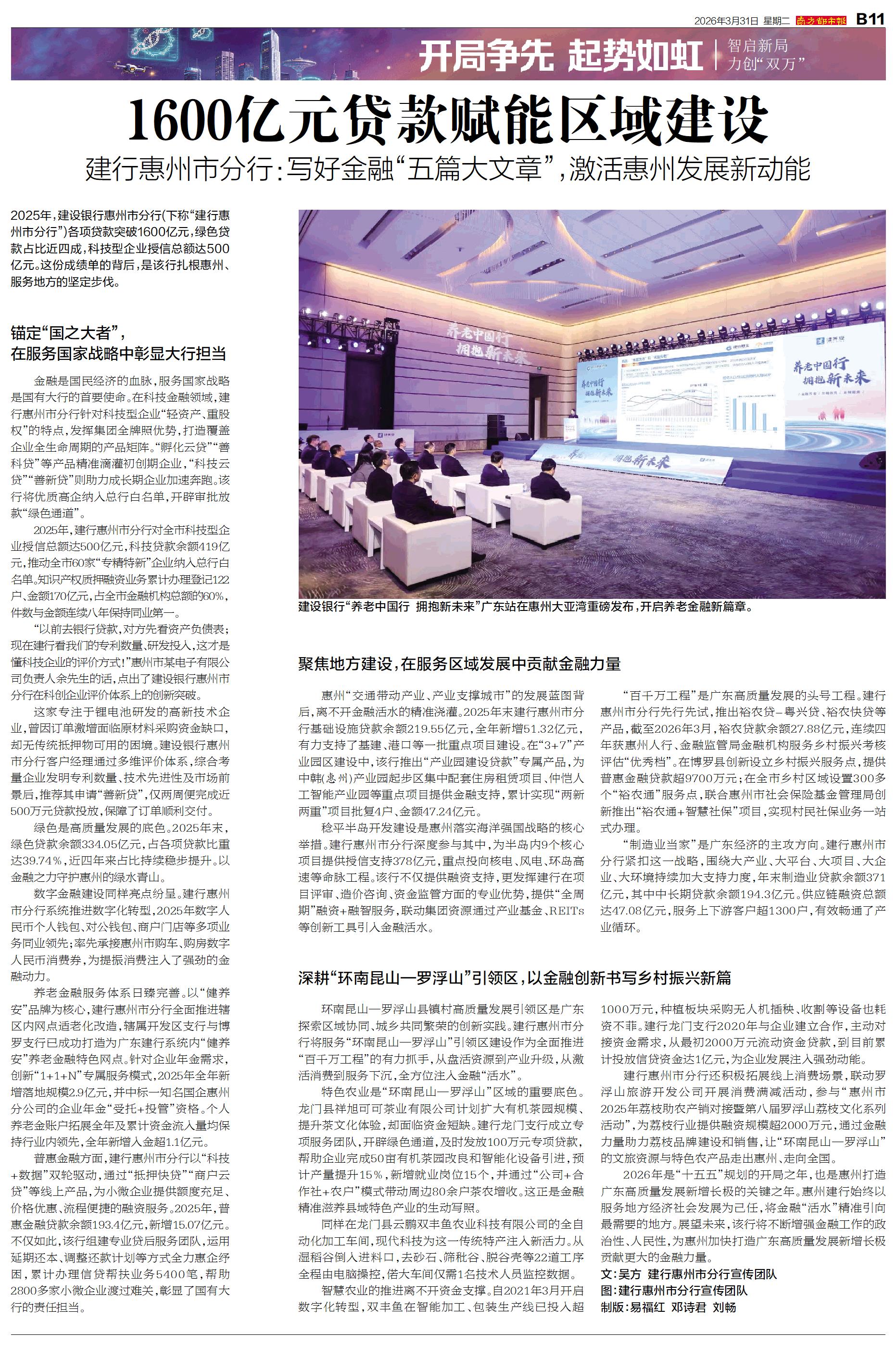 2025年,建设银行惠州市分行(下称“建行惠州市分行”)各项贷款突破1600亿元,绿色贷款占比近四成,科技型企业授信总额达500亿元。这份成绩单的背后,是该行扎根惠州、服务地方的坚定步伐。 锚定
