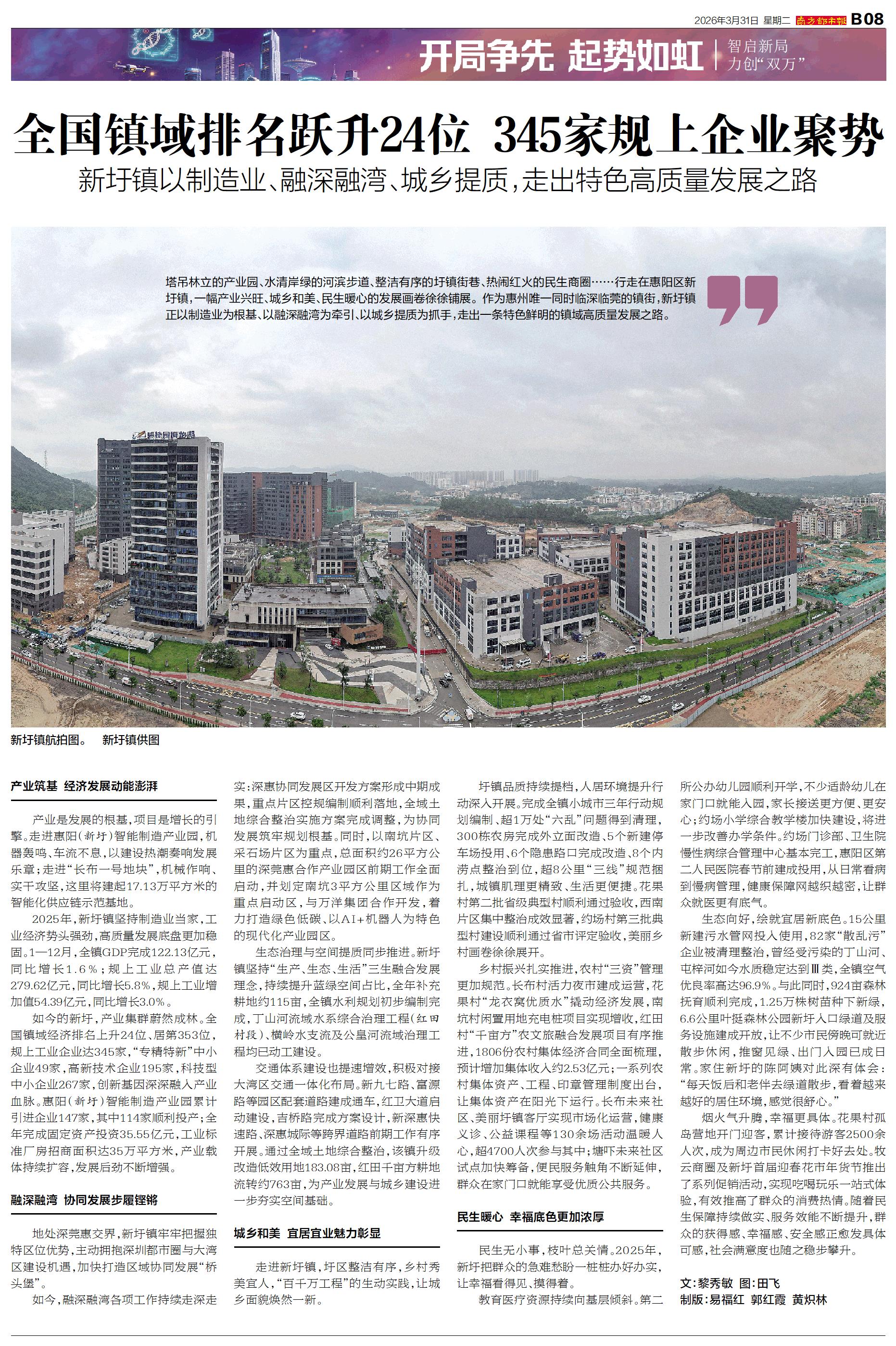 塔吊林立的产业园、水清岸绿的河滨步道、整洁有序的圩镇街巷、热闹红火的民生商圈……行走在惠阳区新圩镇,一幅产业兴旺、城乡和美、民生暖心的发展画卷徐徐铺展。作为惠州唯一同时临深临莞的镇街,新圩镇正以制