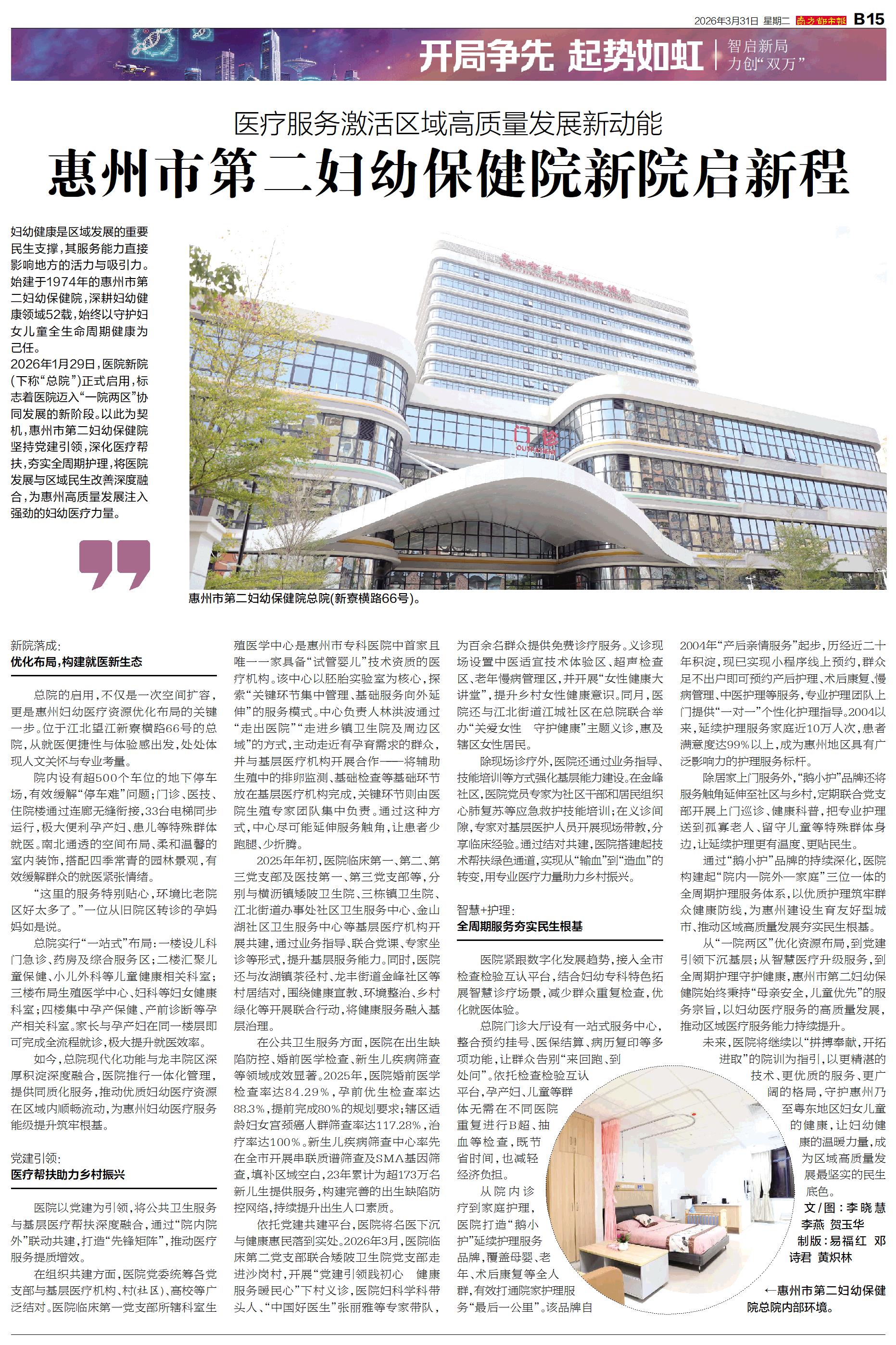 妇幼健康是区域发展的重要民生支撑,其服务能力直接影响地方的活力与吸引力。始建于1974年的惠州市第二妇幼保健院,深耕妇幼健康领域52载,始终以守护妇女儿童全生命周期健康为己任。 2026年1月2