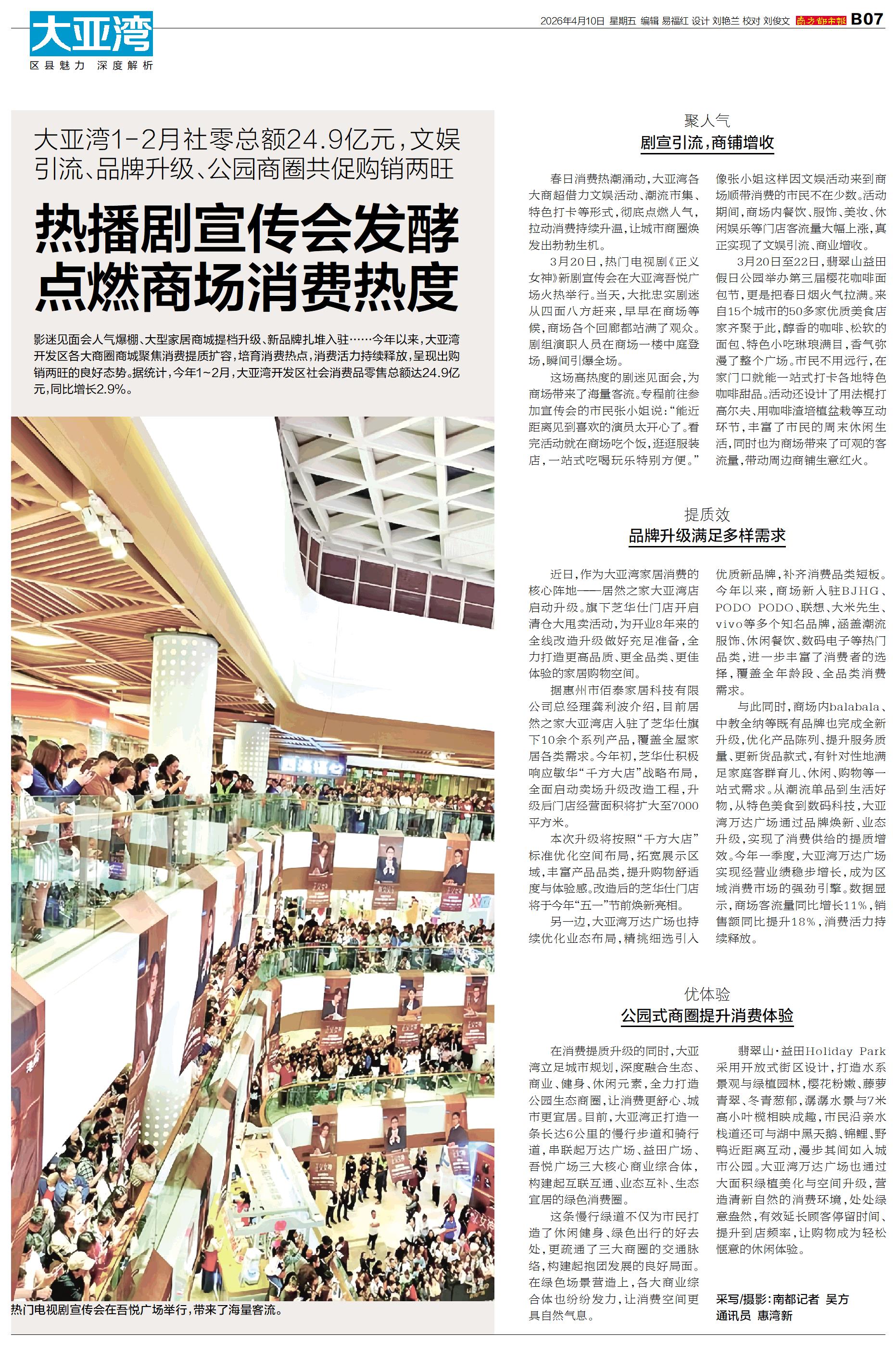 影迷见面会人气爆棚、大型家居商城提档升级、新品牌扎堆入驻……今年以来,大亚湾开发区各大商圈商城聚焦消费提质扩容,培育消费热点,消费活力持续释放,呈现出购销两旺的良好态势。据统计,今年1~2月,大亚