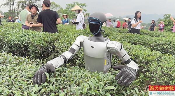 传统技艺之外,科技的融入让活动焕发别样活力。茶垄之间,一台来自宇树科技的采茶机器人灵活穿梭,精准模拟“一芽两叶”的采摘动作,还会挥手、比心、握手,与游客互动,成为茶园里的“流量担当”。