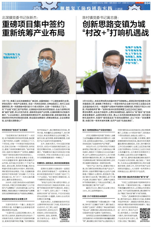 保障产业链各环节顺畅衔接和上下游企业协同复工,是陈村推进复工复产的“大招”。3月18日早上,夹着雷声和雨水的强对流天气席卷佛山。顺德区陈村镇党委书记黄志捷戴着口罩,连轴跑了两场会议:一场是与镇内企业家