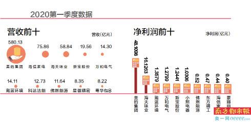 2020年第一季度,美的集团依然领跑佛山板块,虽然增长率有所下降,营业收入和净利润依然双双登顶,分别为580.13亿元和48.11亿元。季报显示,美的集团收到海外订单同比增长超25%。创新营销,积极抗疫,采取微信营销、直播引流、秒杀活动等新的营销模式,2020年第一季度全网销售约135亿,同比增长11.7%,线上收入占内销45.6%。其中空调线上、线下市场份额均位居行业第一,线上市场份额44.9%,增长13.5%;线下37.3%,增长5.8%。